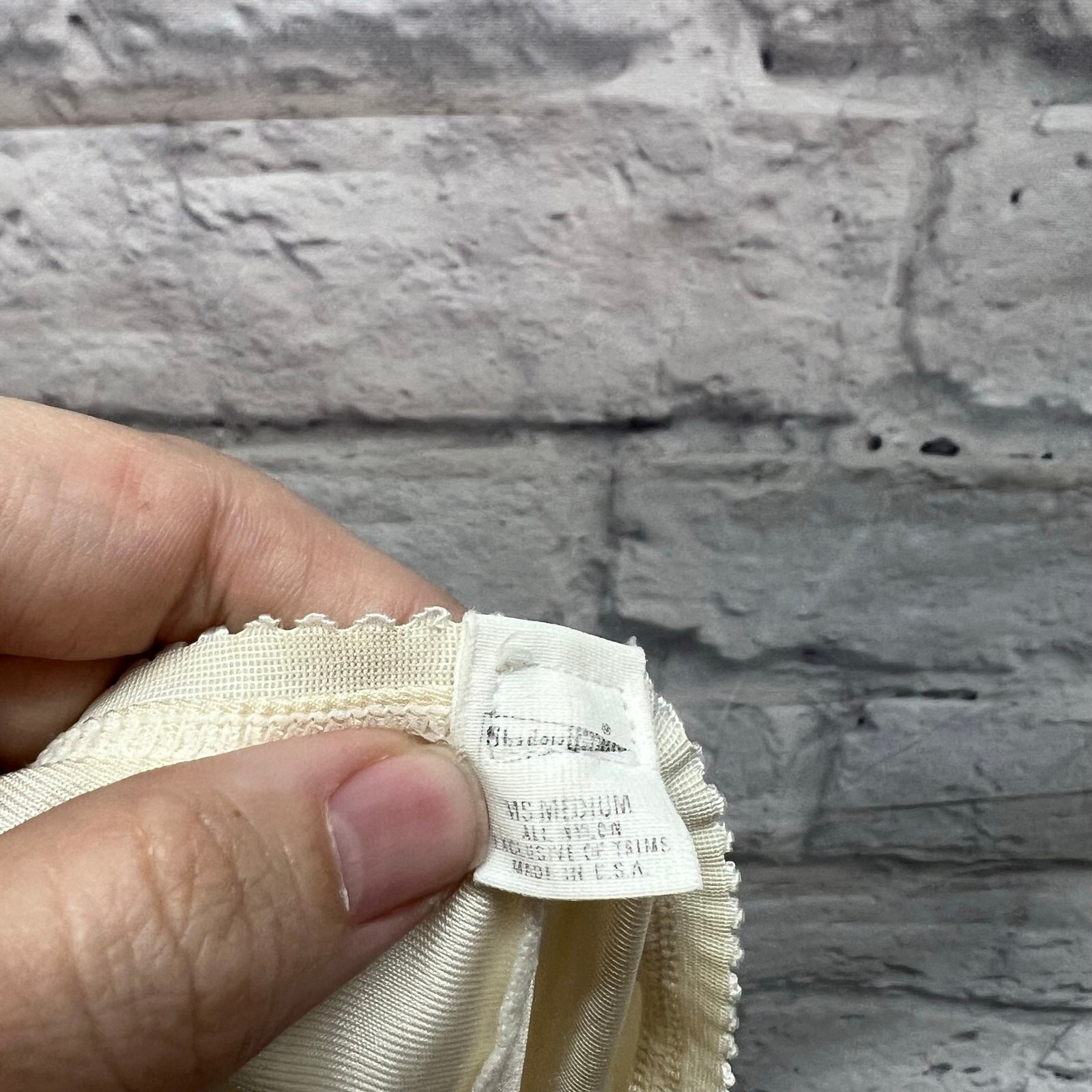 как выглядит Vintage Shadowline Half Slip Pillow Tab Ivory Size M Lace Trim Side Slits фото