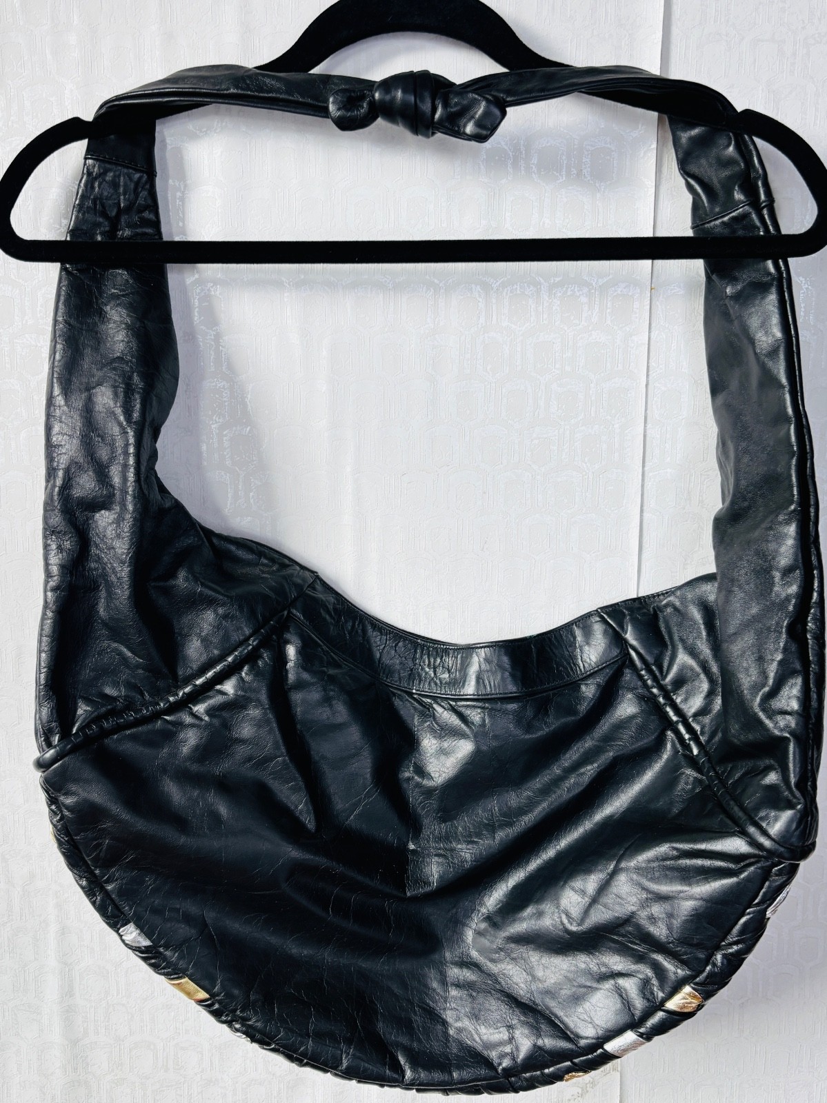 VTG 80'S BLACK LEATHER GOLD SILVER METALLIC PATCHWORK POUCH BAG HOBO PURSE