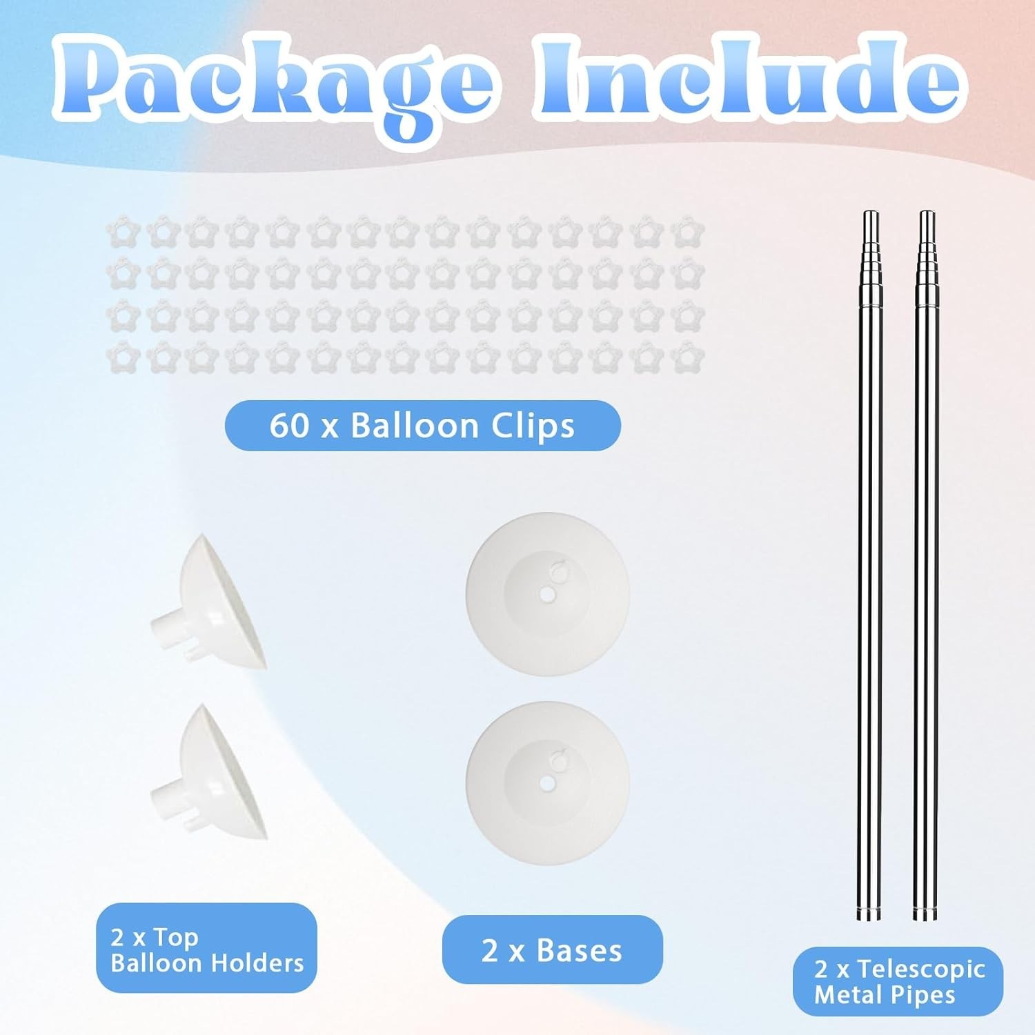Included Components: Balloon Stands, Metal Telescopic Pillars, Bases, Top Balloon Hold