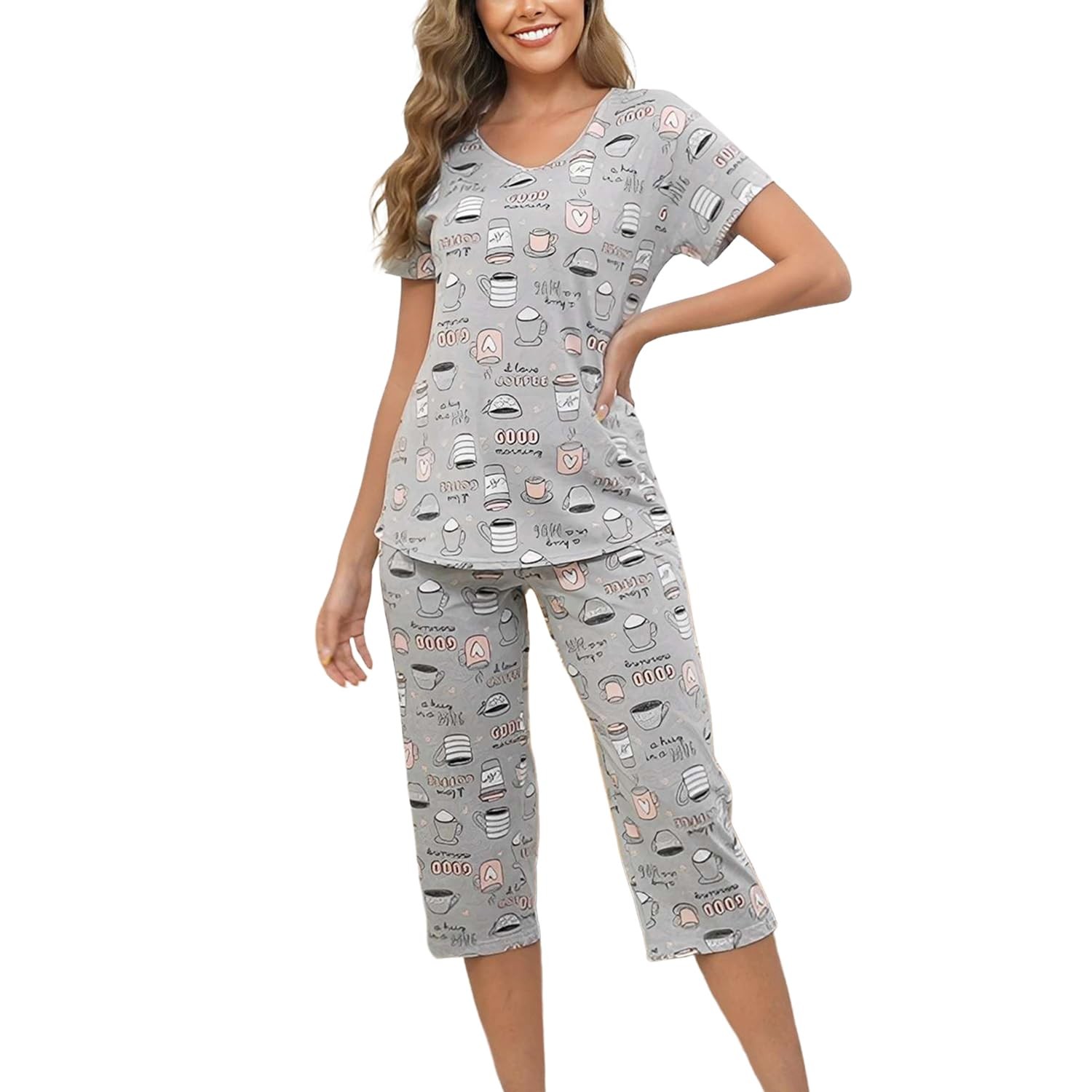 как выглядит Womens Cotton Pajama Sets Short Sleeve Top With Capri Pants 2 piece sets for ... фото