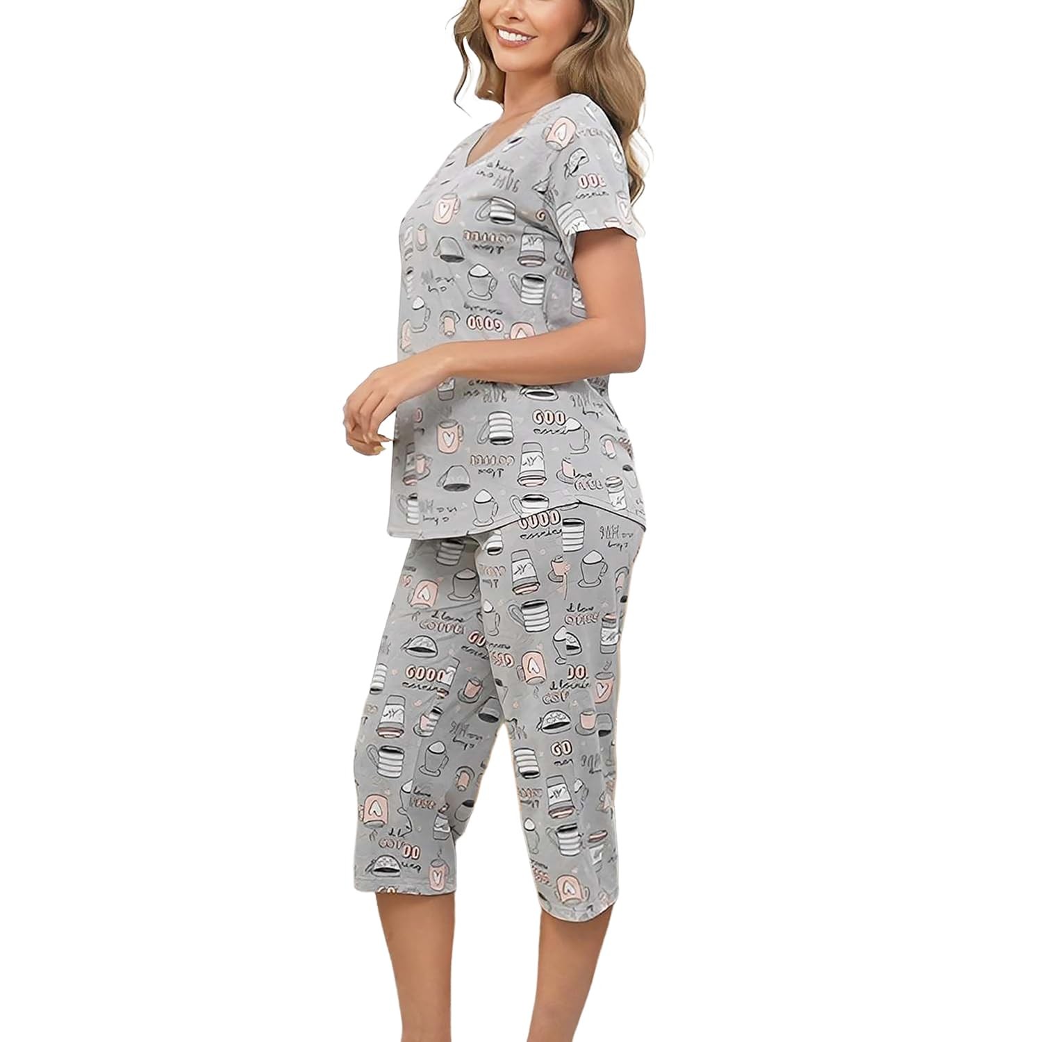 Womens Cotton Pajama Sets Short Sleeve Top With Capri Pants 2 piece sets for ...