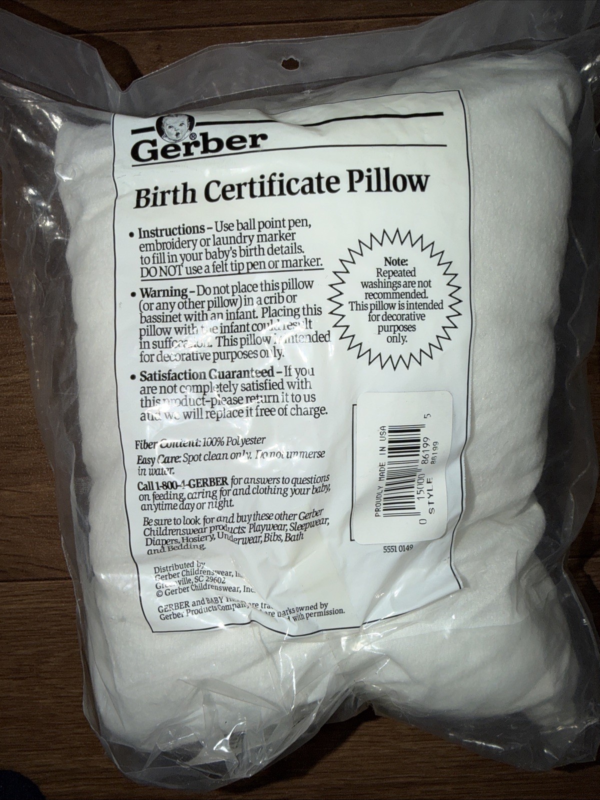 NIB Vintage Newborn Baby Gerber Birth Certificate Keepsake Pillow New Rare