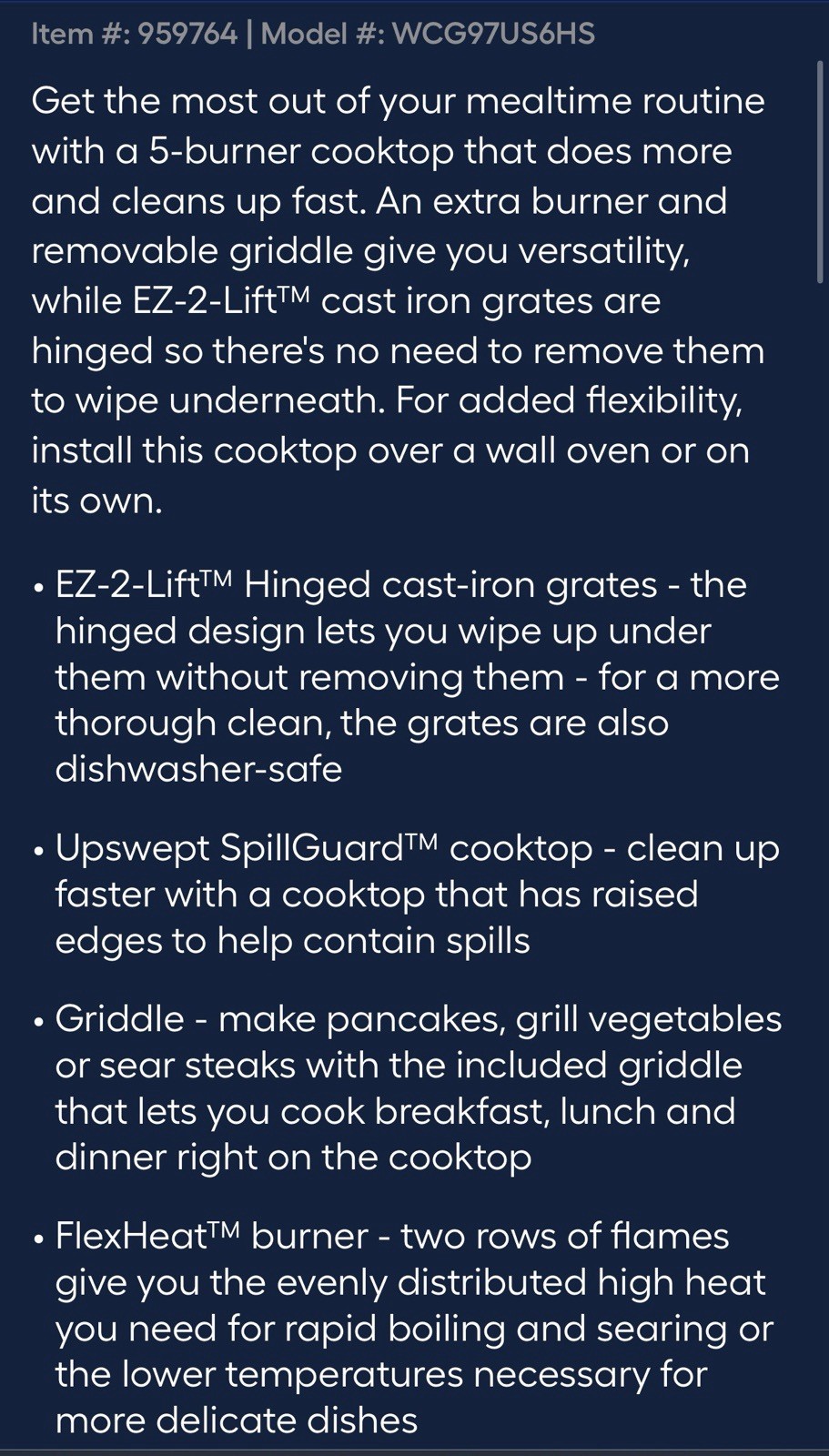 Whirlpool WCG97US6HS 36 Gas Cooktop with Griddle - Originally 1459