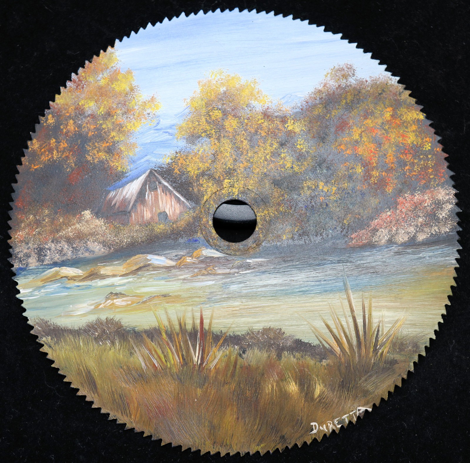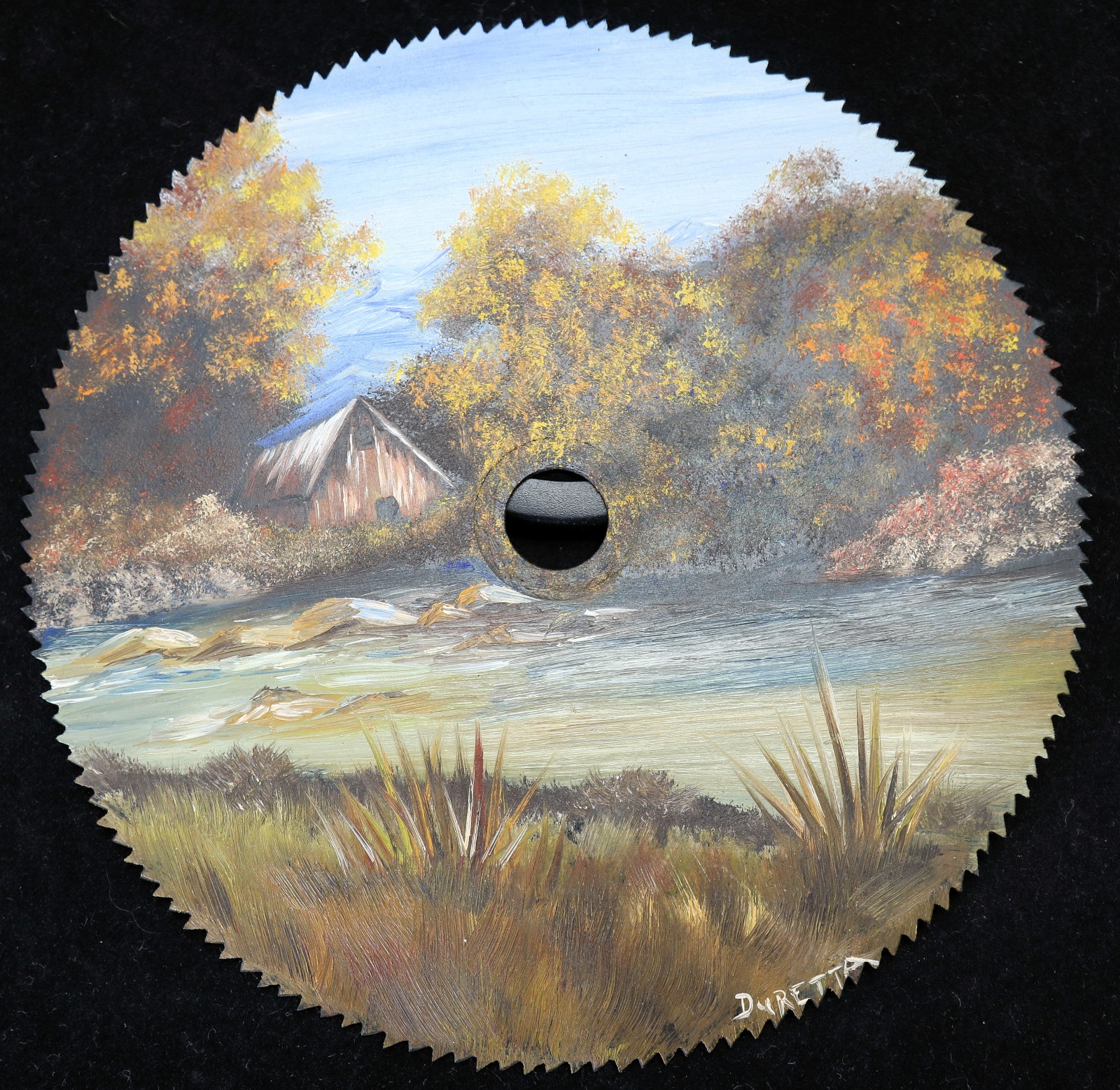 Vintage Hand-Painted Saw Blade Folk Art Barn on Pond Signed 6.5 inch
