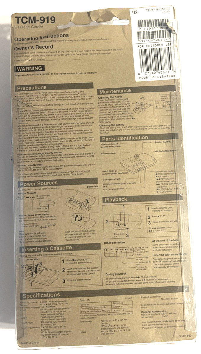 Sony TCM-919 Cassette Recorder Vintage Portable Player Open Box No Adapter