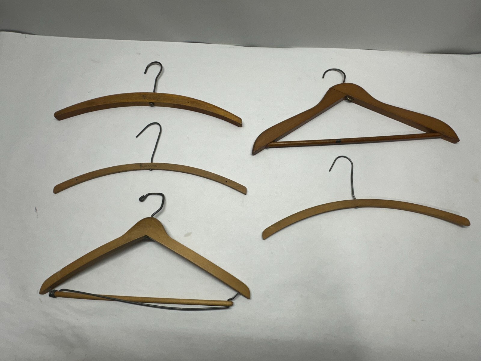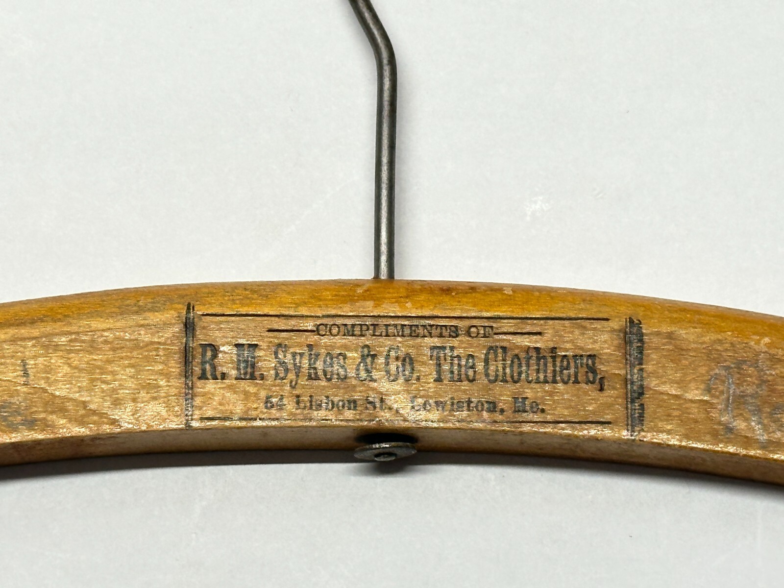 5x Vintage Wooden Clothes Hangers Advertising Maine Woodfields Lewiston Augusta