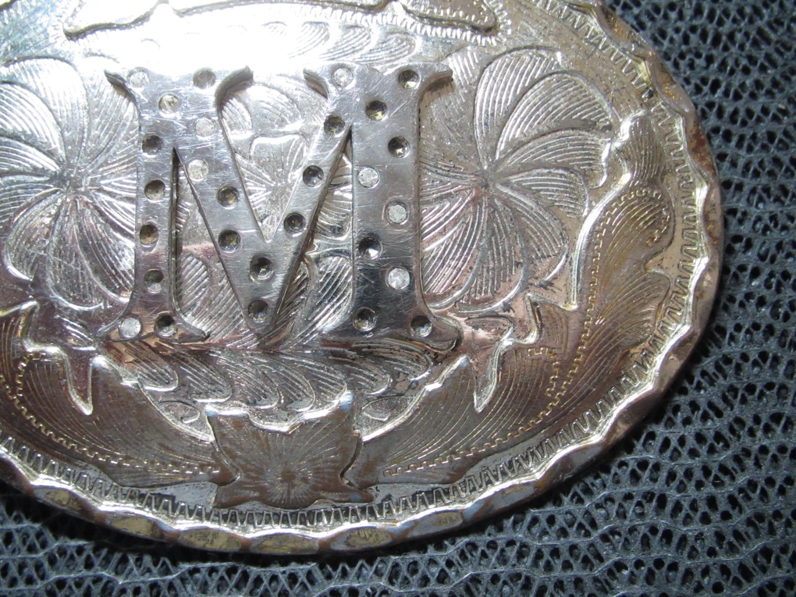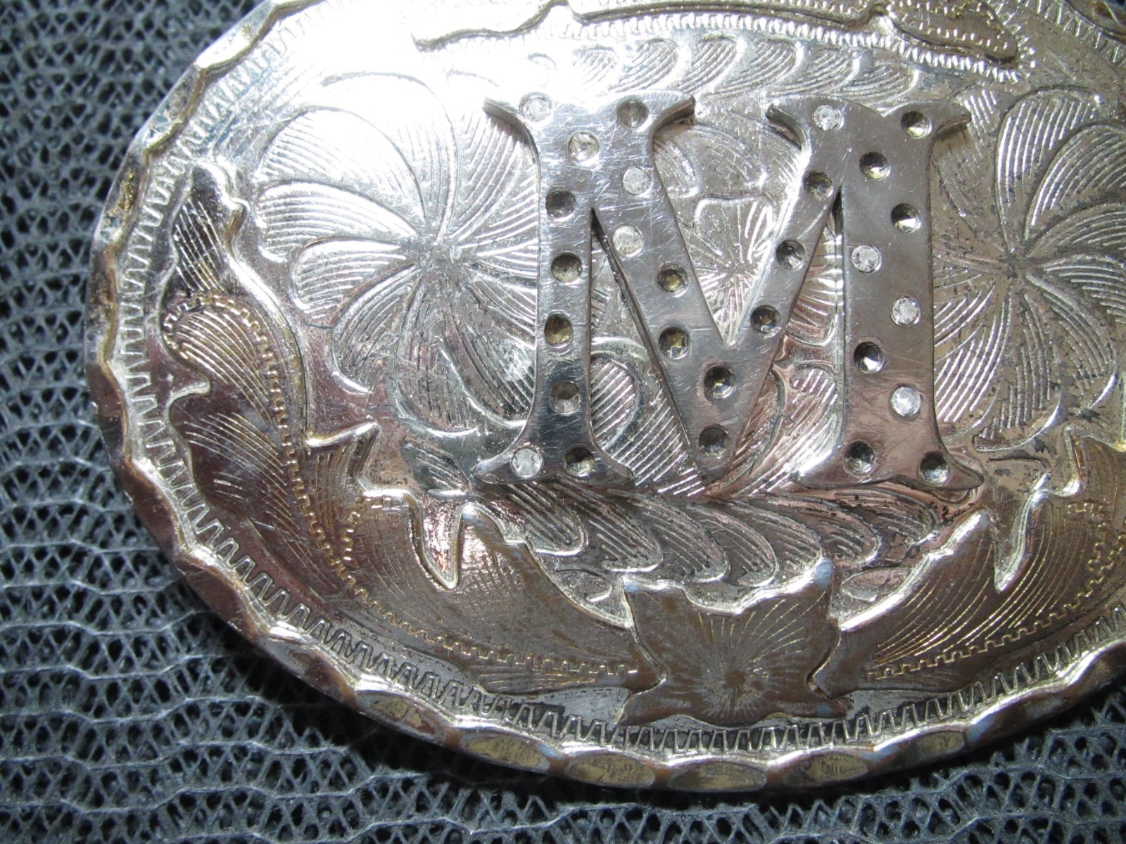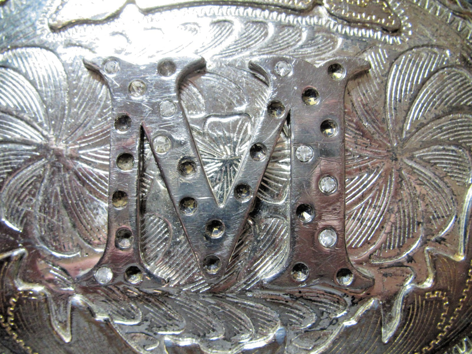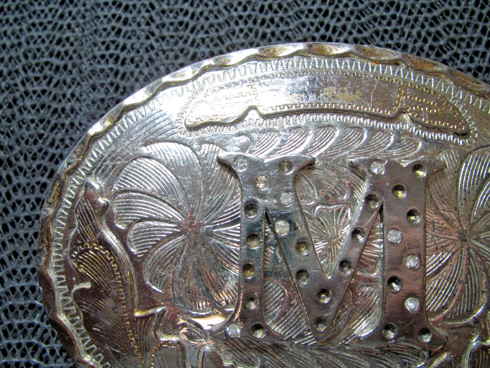 LARGE WESTERN M INITIAL COWBOY COWGIRL BELT BUCKLE VINTAGE MISSING RHINESTONES