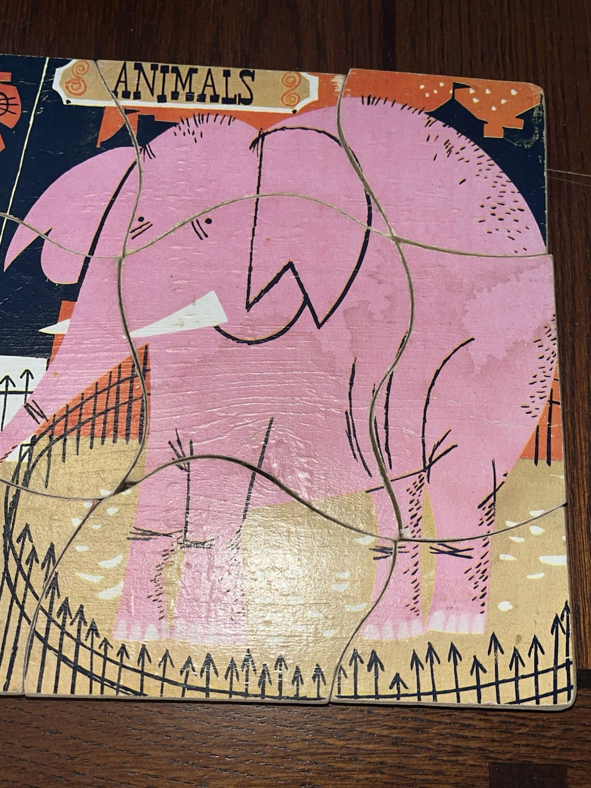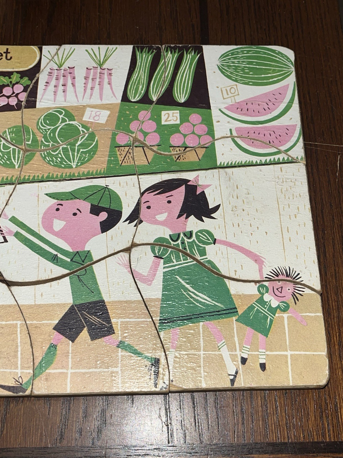 как выглядит 2 Vintage Wooden Puzzle Double Sided 4 Pictures OLD 12 Pieces Farm Zoo Market 1 фото