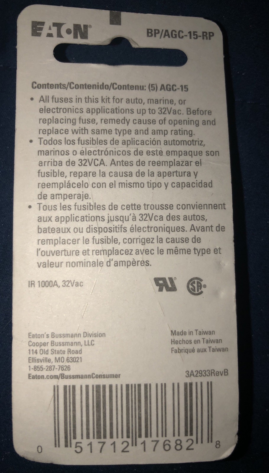 Bussmann AGC 15 Amp fast-acting glass tube fuses.