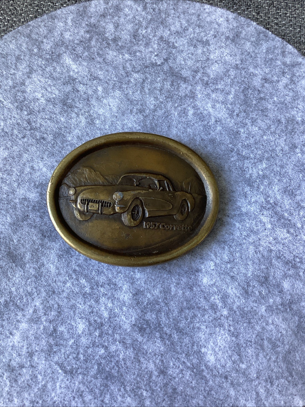 как выглядит Vintage 1957 Chevy Corvette Oval Brass Belt Buckle Indiana Metal Craft Race CA19 фото