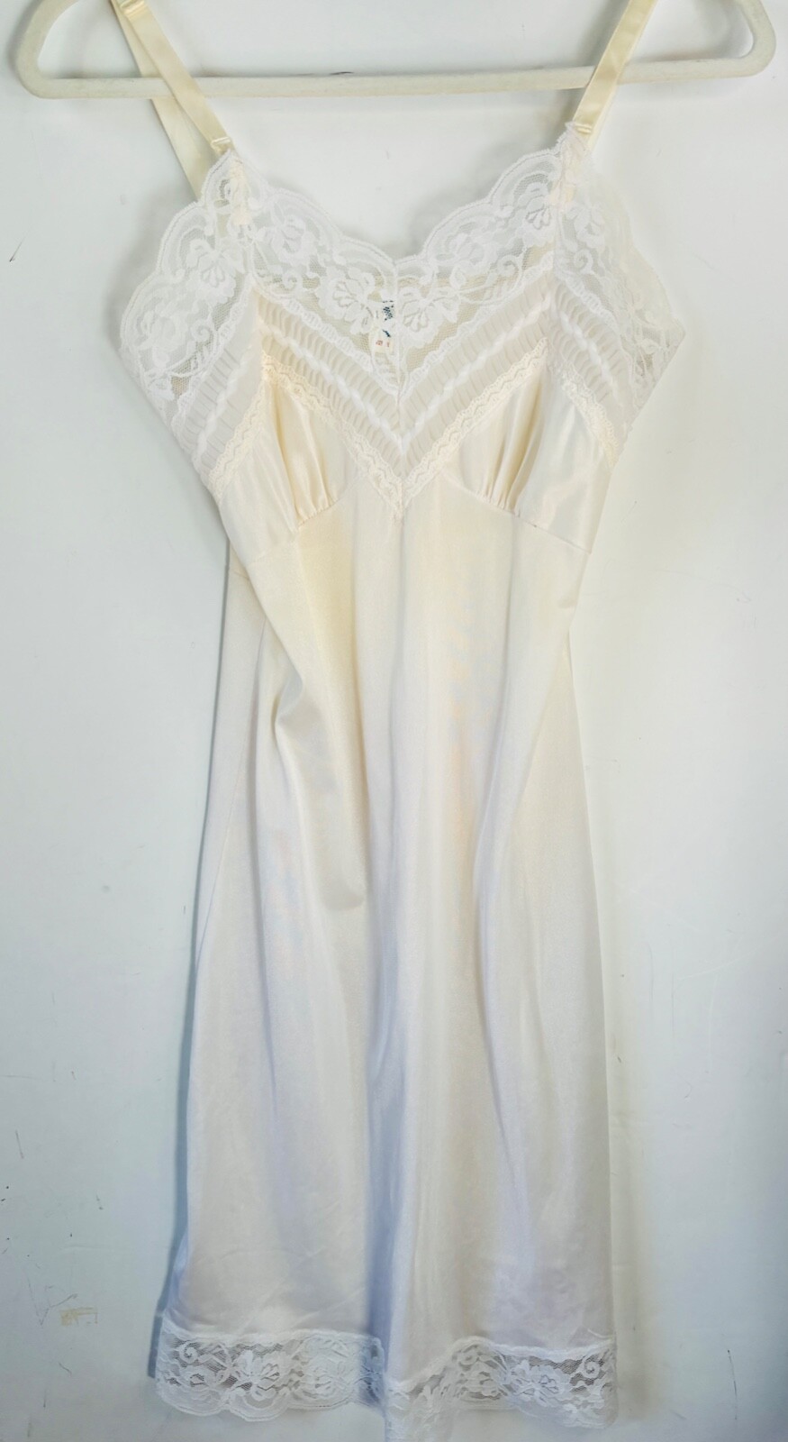 как выглядит VTG 70S VINCENT BOMBSHELL SOFT WHITE LACE TRIM FULL SLIP CHEMISE NEGLIGEE 32 S фото