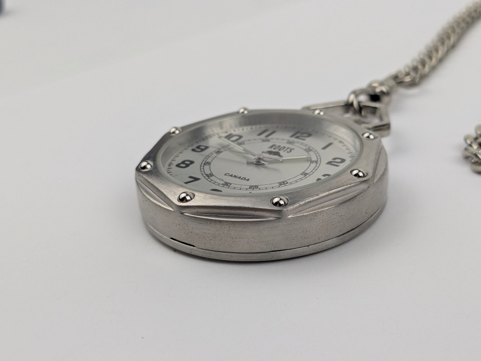 как выглядит Vtg NEW OLD STOCK Roots Canada Pocket Watch R209 W/ Fob Chain 44mm фото