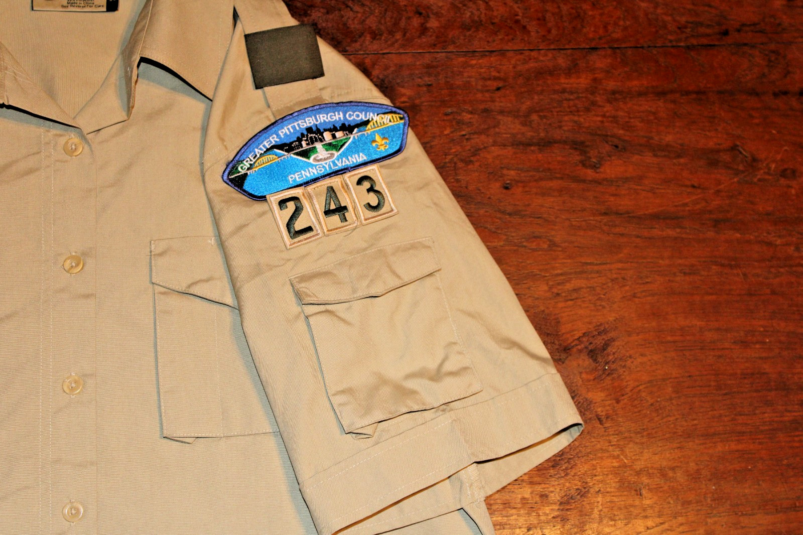 Boy Scouts of America BSA Women's Shirt Tan Large Sewn Patches Short Sleev
