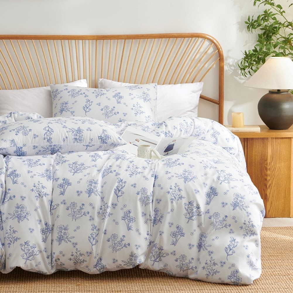 Blue Floral Duvet Cover Full Farmhouse Botanical Flower Bedding Set for Girls...