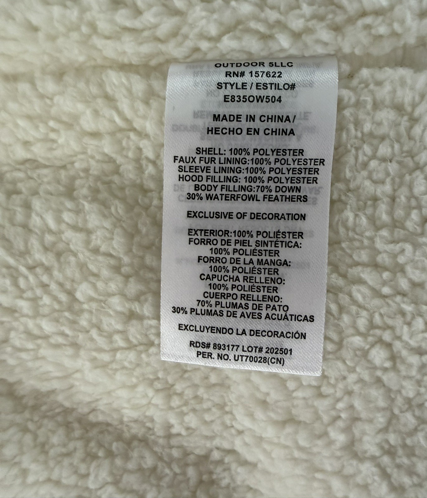 Outer Shell Material: 100% Polyester