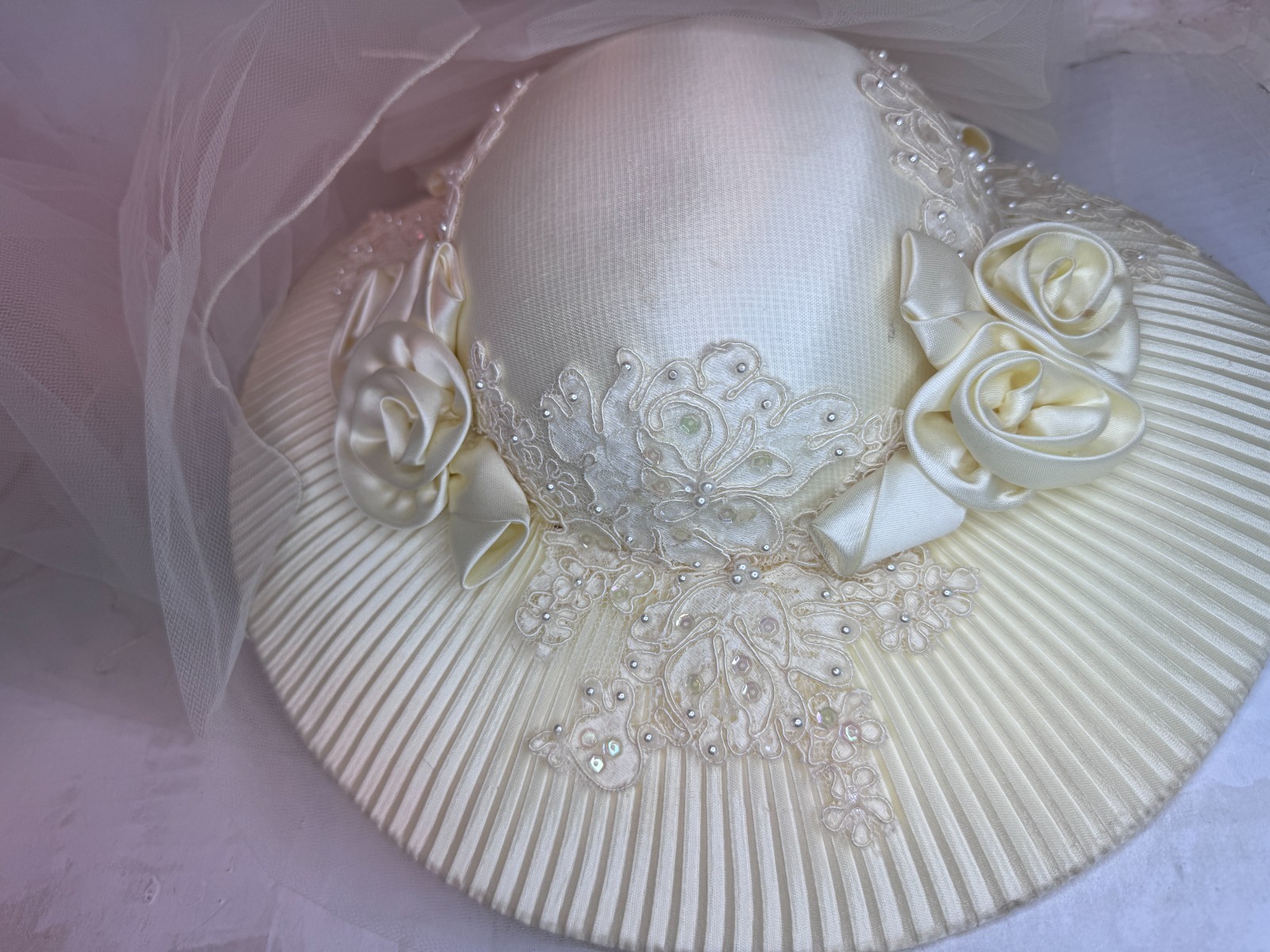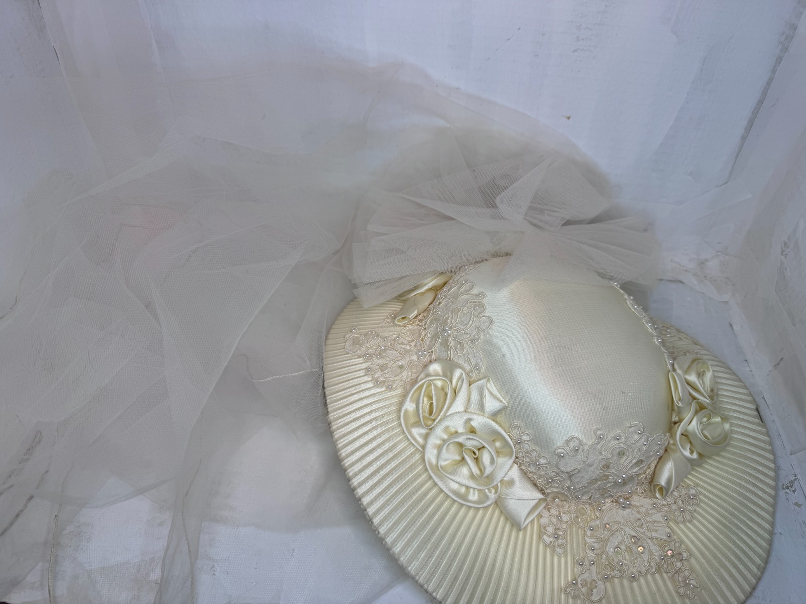 Vintage Bridal Wedding Hat W 34 Veil White Seed Pearls Sequins Large 1980s VTG