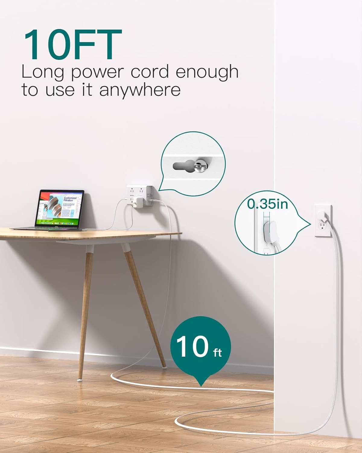 10FT Flat Plug Extension Cord with Multiple Outlets, Surge Protector Power Strip