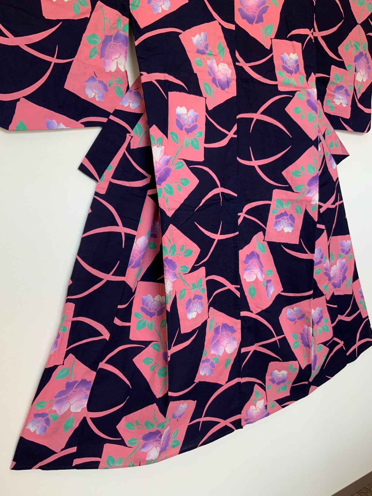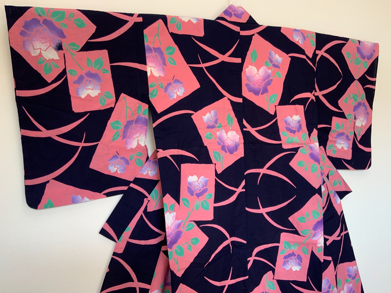 • Japanese Yukata Kimono Women Navy Pink Rose Floral Cotton Used 56"