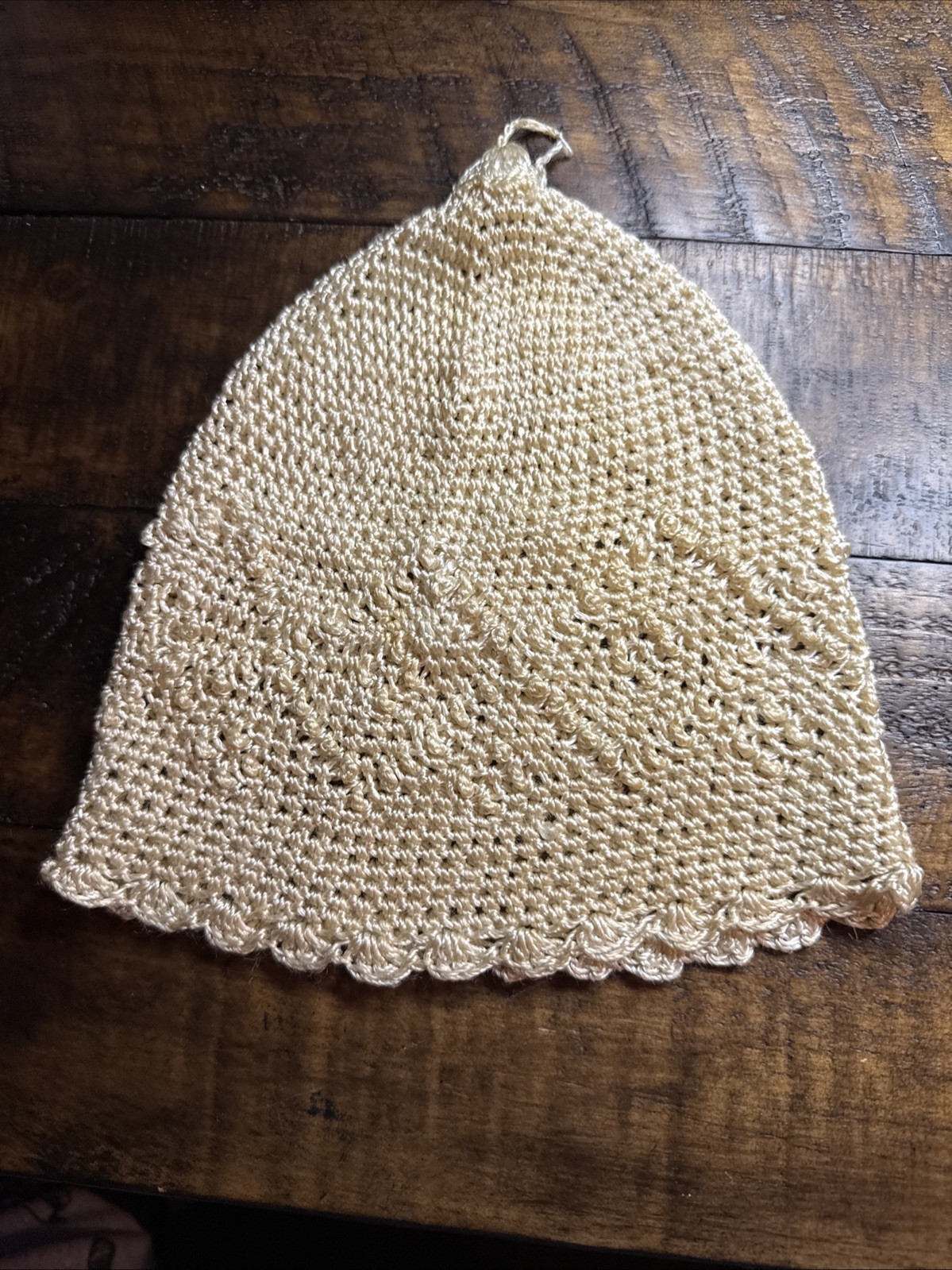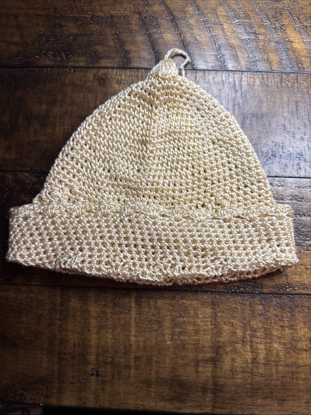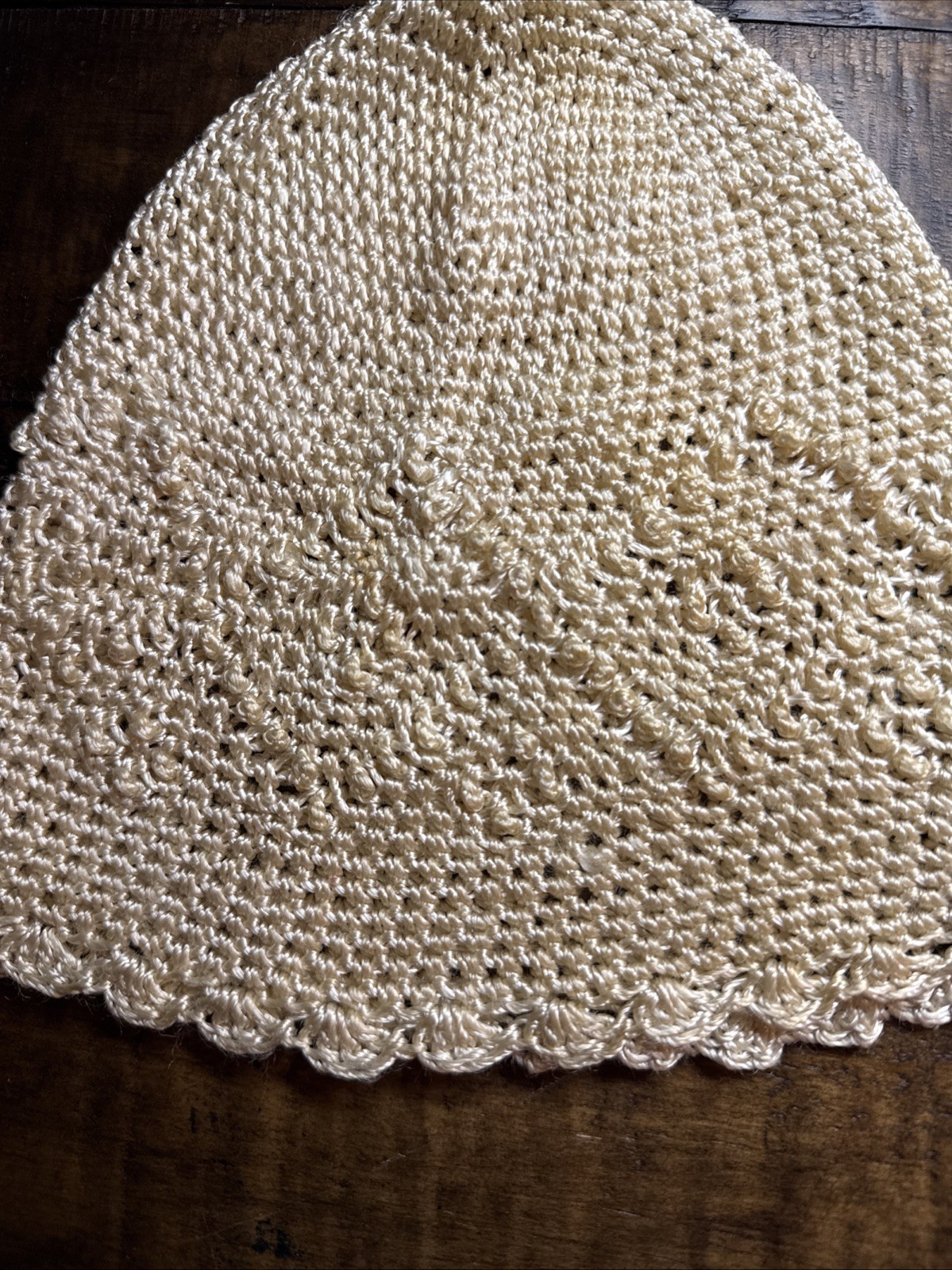 Antique Crocheted Cap Baby Christening Cap Natural Ivory Scallop Edges Tatted