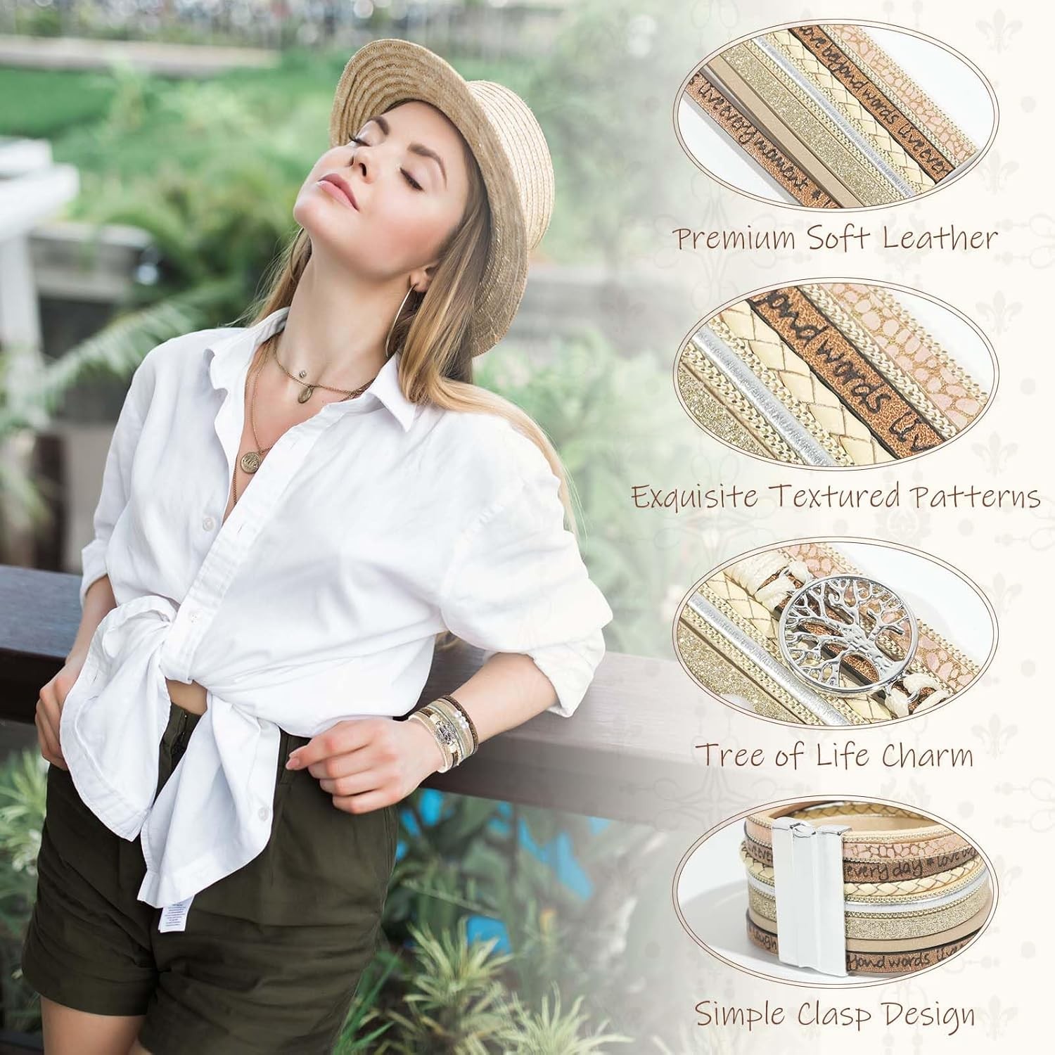 Leather Wrap Bracelet for Women, Boho Cuff Bracelet with Strong Clasp, Multi-Lay