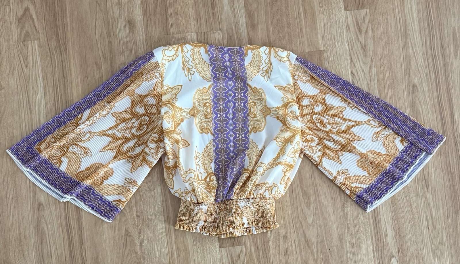как выглядит EUC Flying Tomato Kimono-Style Wrap Blouse - Pleated Sleeves/Smocked Waist - S фото