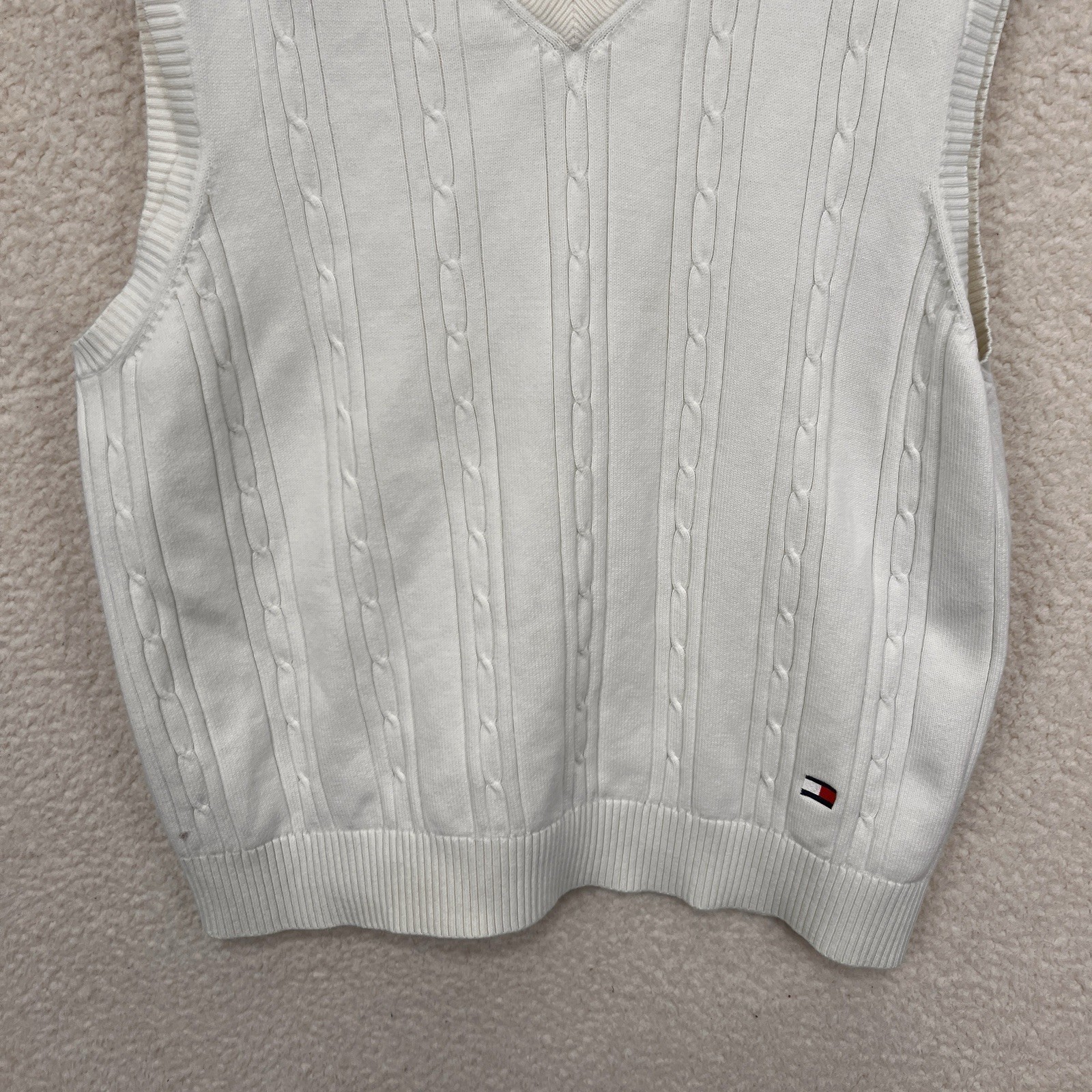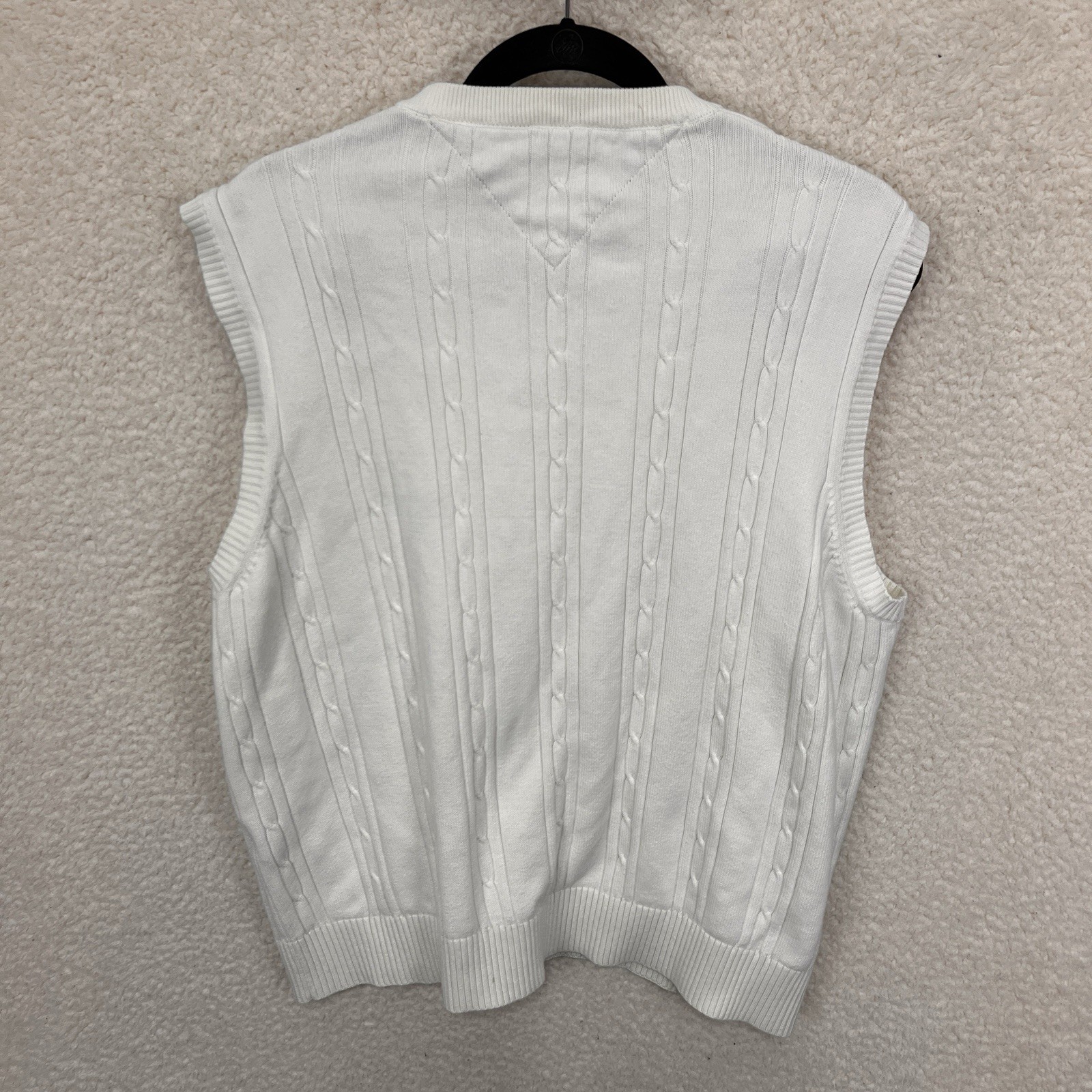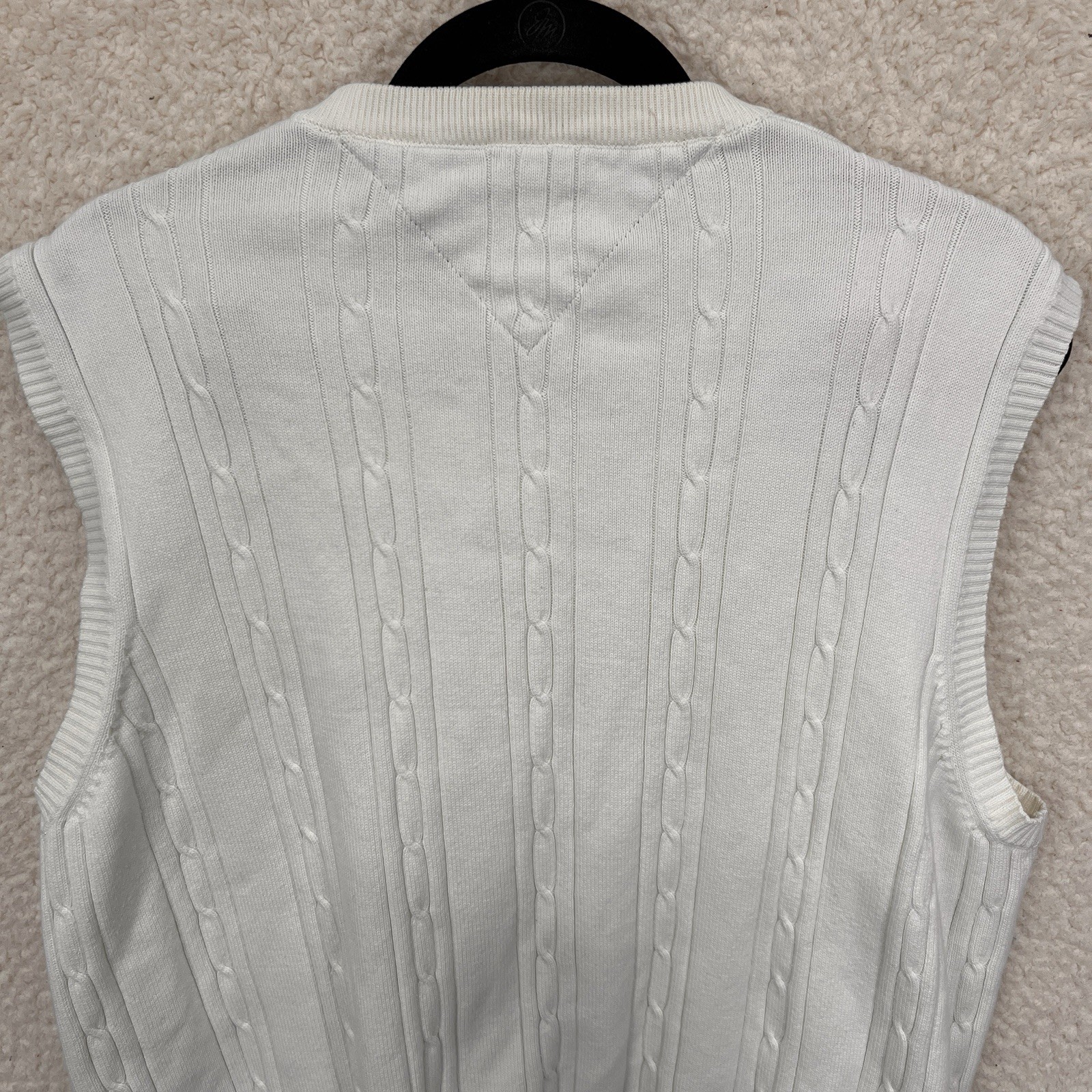 VTG Tommy Hilfiger Sweater Vest Mens L White Flag Logo Cable Knit V Neck Preppy