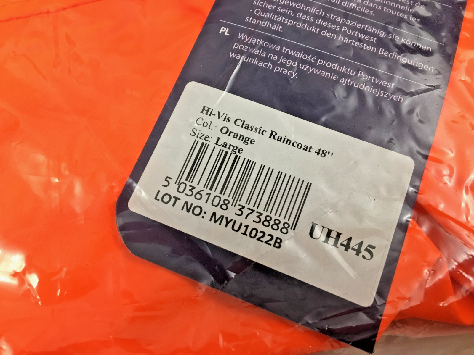 Portwest UH445 Hi Vis Classic Raincoat 48 Orange Large new in package - 1 ea.