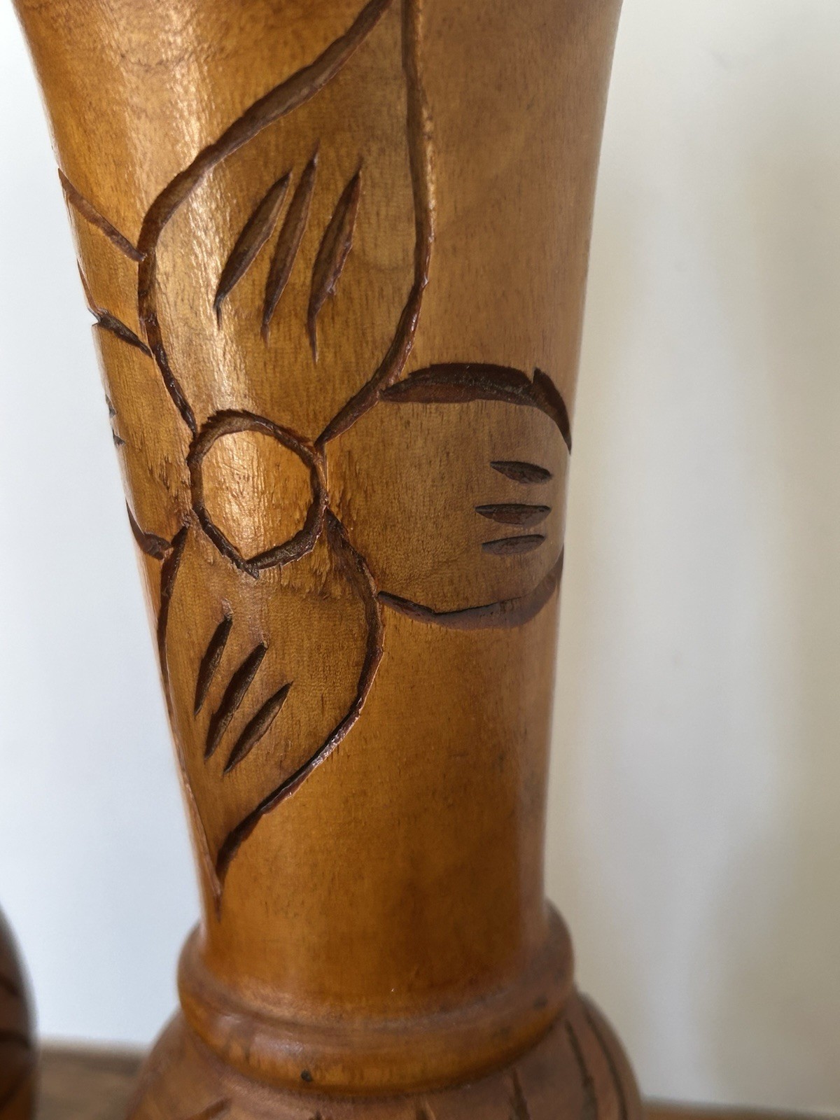 как выглядит 2 Vintage Hand Carved Wooden Etched Floral Vase 9" High фото