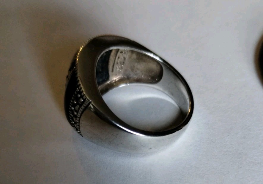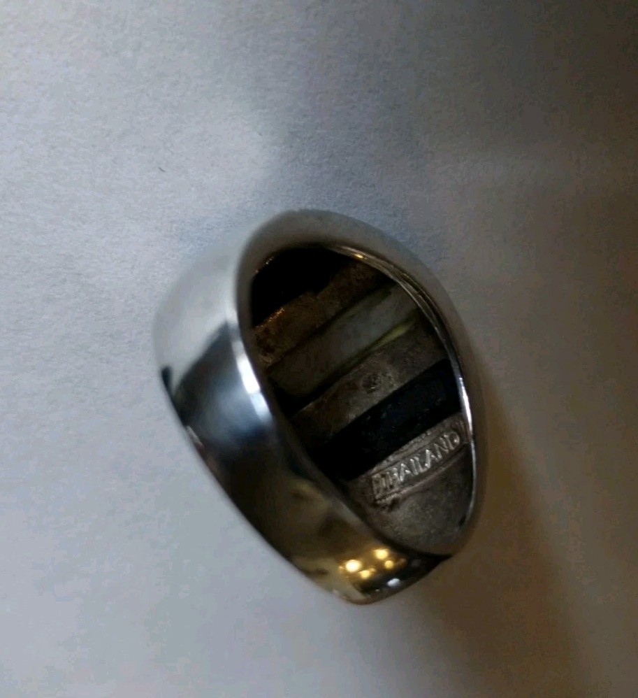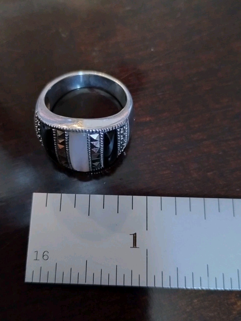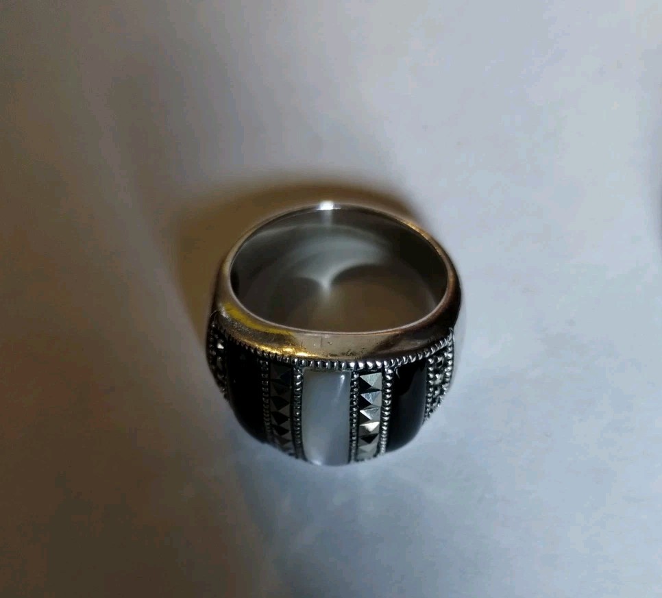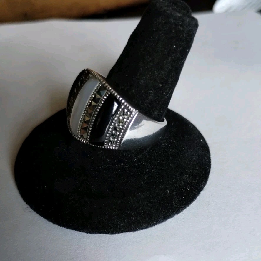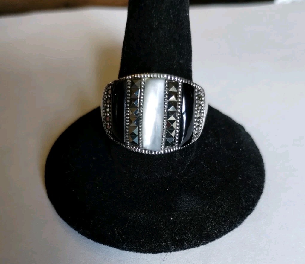 как выглядит Vtg Sterling Silver Black Onyx Mother Of Pearl Marcasite Inlay Dome Ring Size 8 фото
