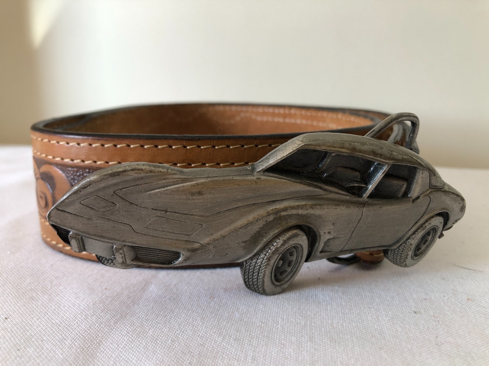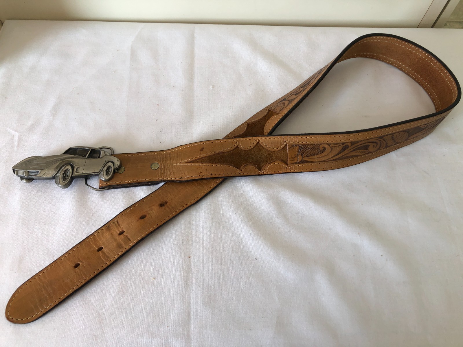 Vintage Chevrolet Corvette Belt Buckle 1979 on Hand Tooled Leather Belt