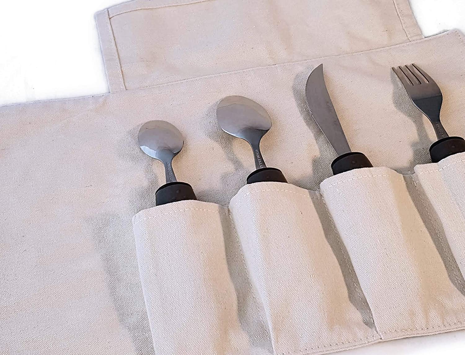 Особенности: Dishwasher Safe, Lightweight, Non-Slip Handles, Large Easy-Grip Handles, Adaptive Design, 4-piece set: fork, knife, tablespoon, teaspoon, Lightweight foam handles for easy grip, Rust-resistant stainless steel construction, Dishwasher safe for easy cleaning, Includes discreet canvas travel wrap