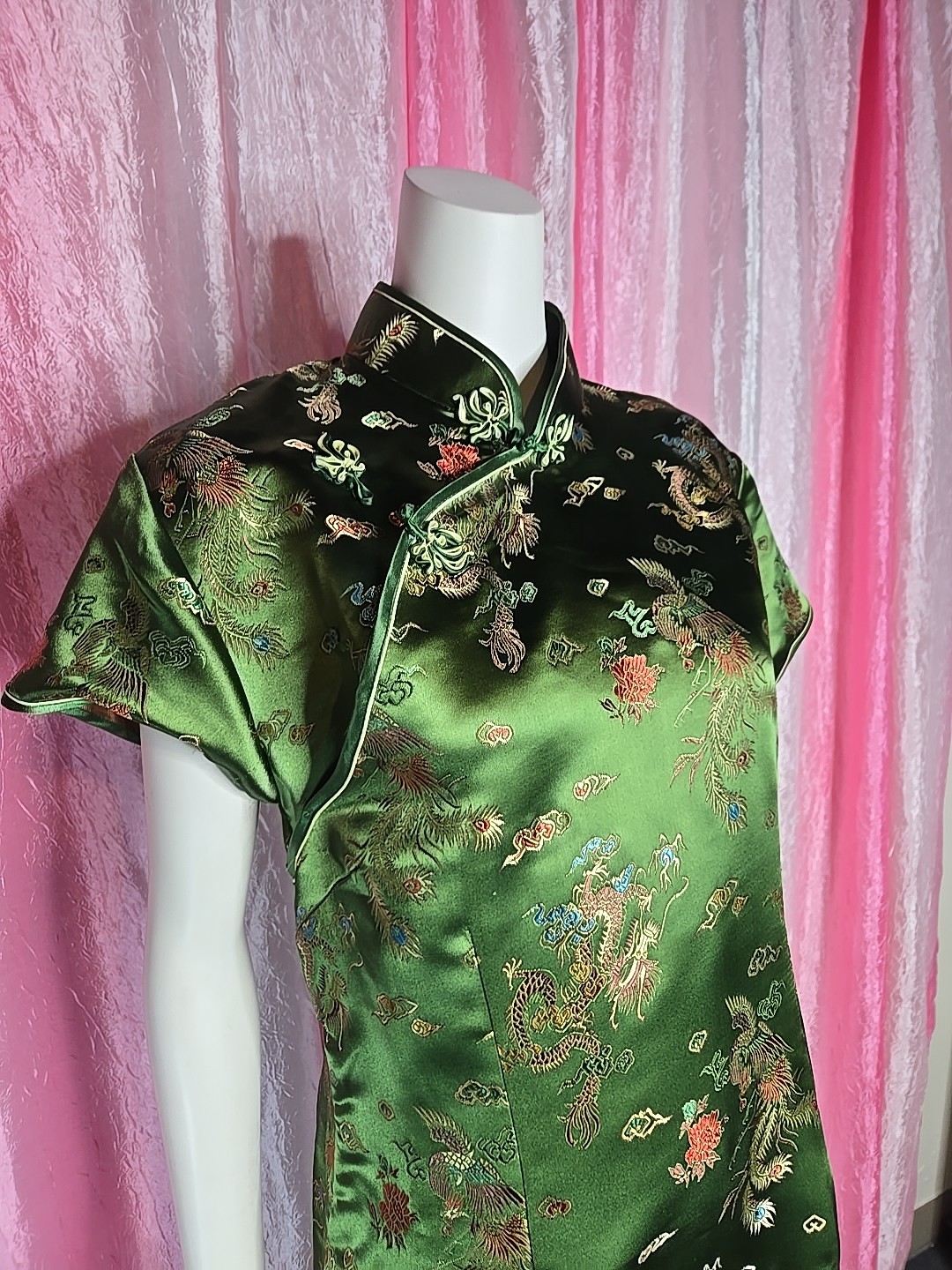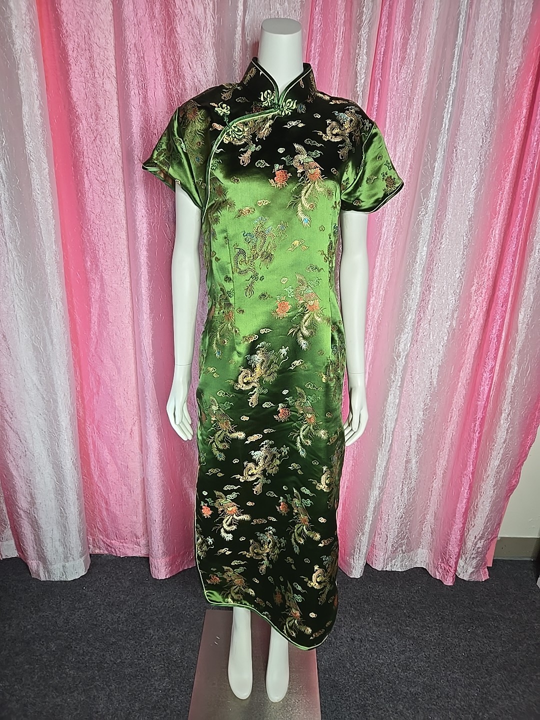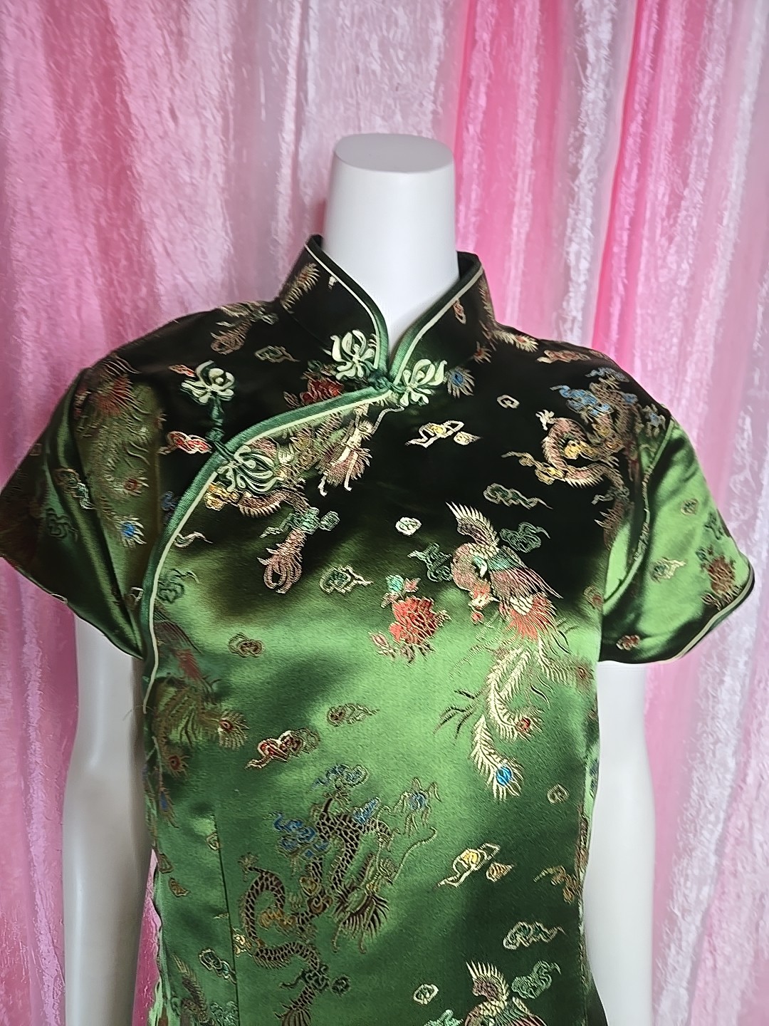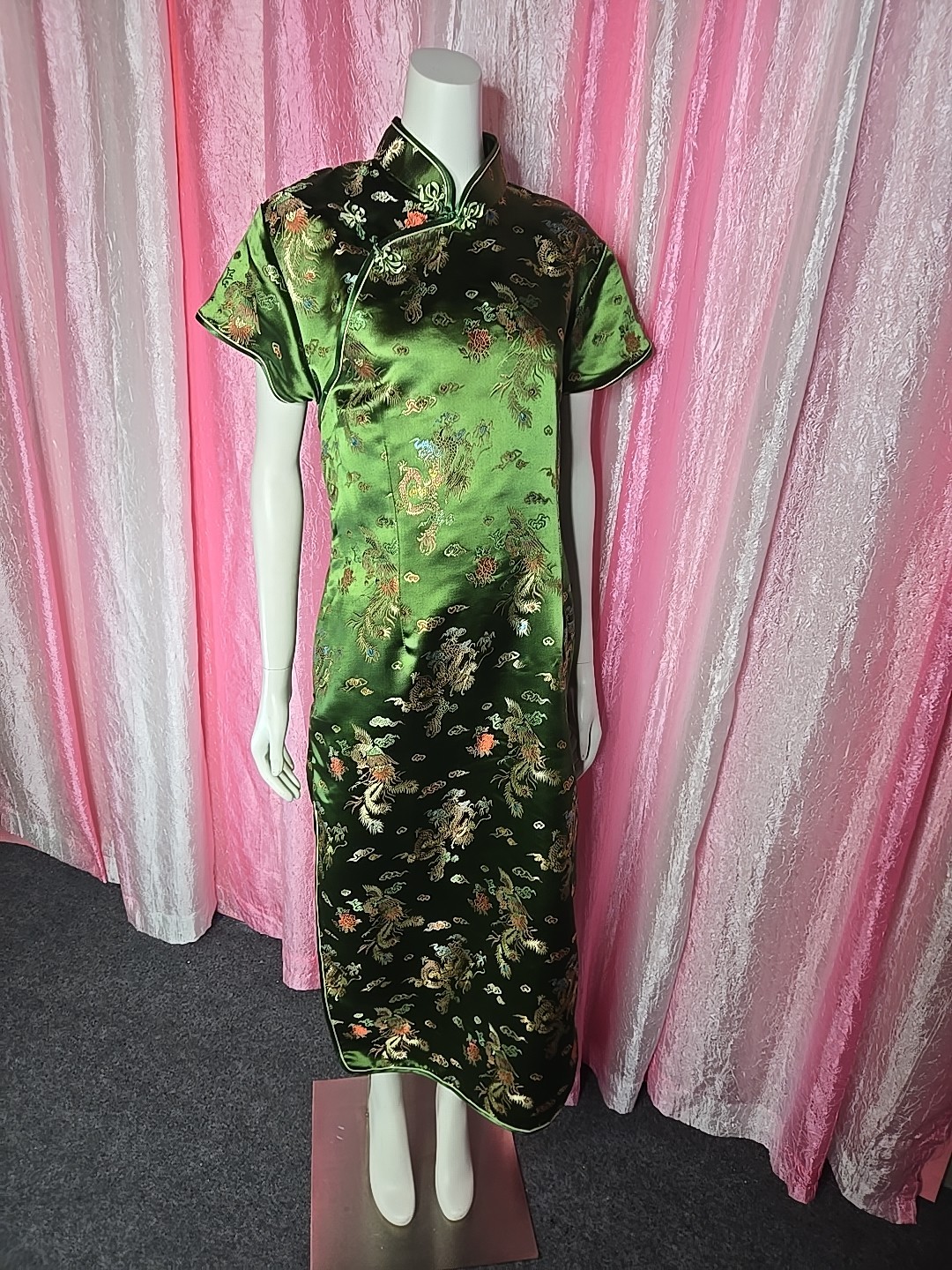 Lian Lin Vintage Grean Asian Floral Emrbroidered Satin Maxi Dress Size Large