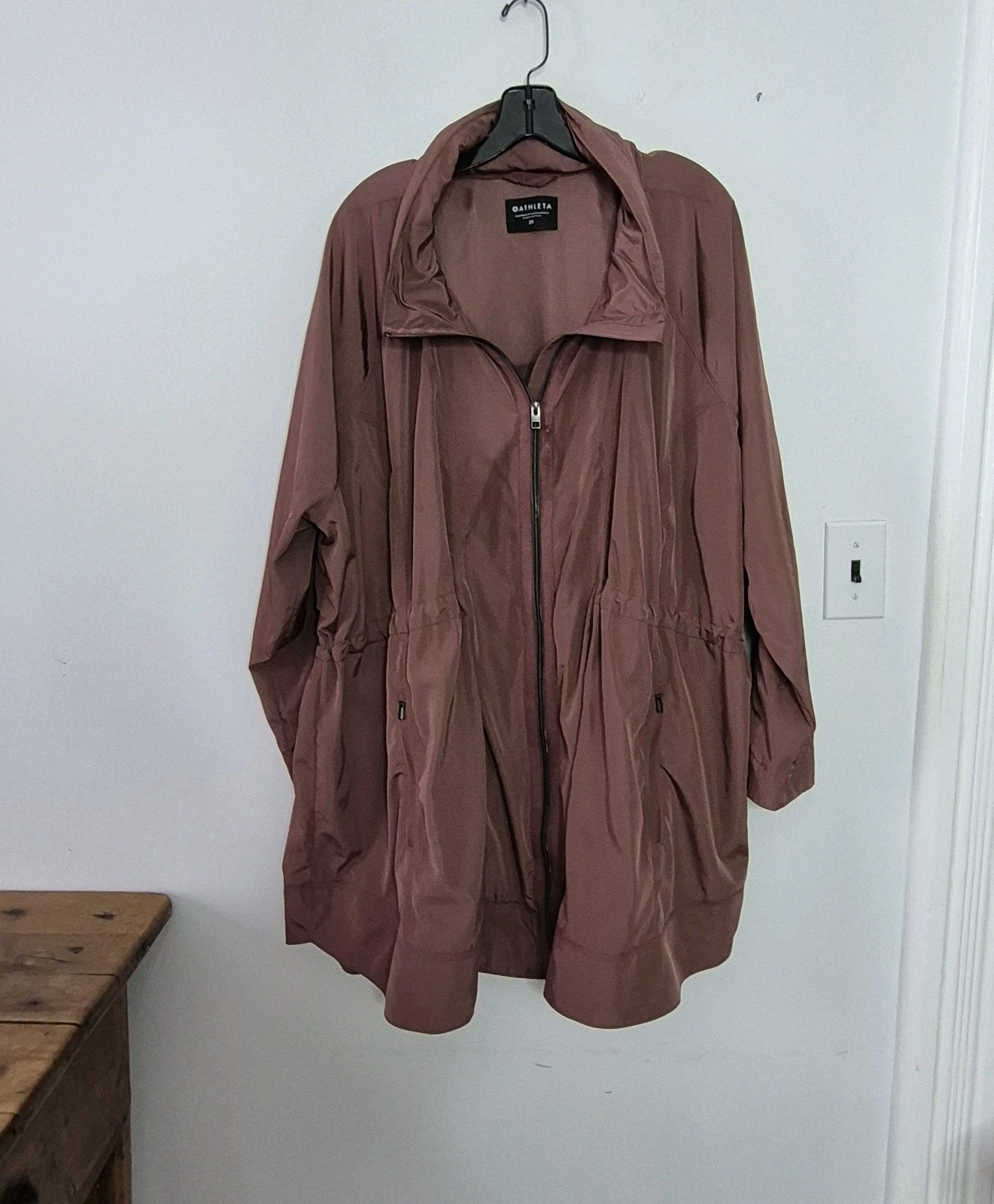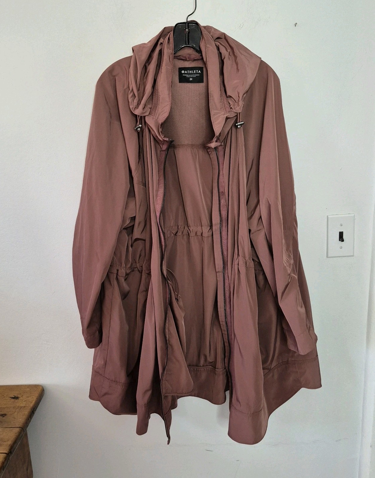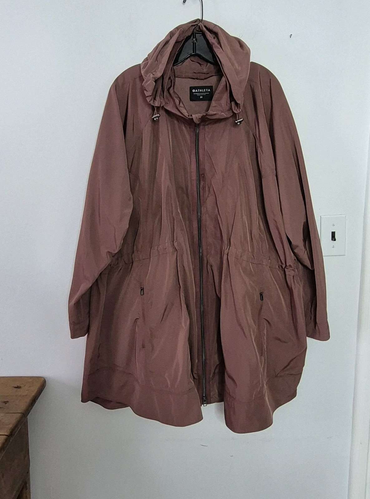 как выглядит ATHLETA 2X Drip Drop Lightweight Full Zip Rain Jacket Dusty Rose Stowaway Hood фото