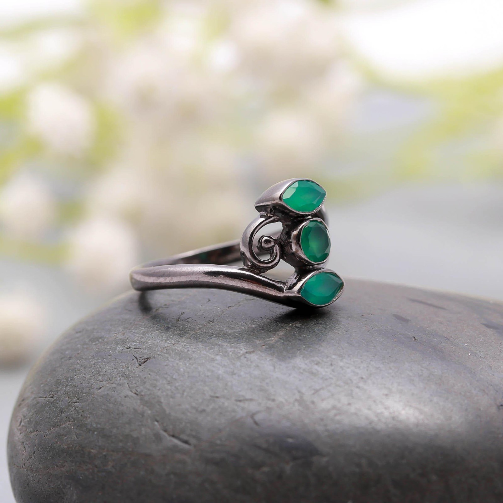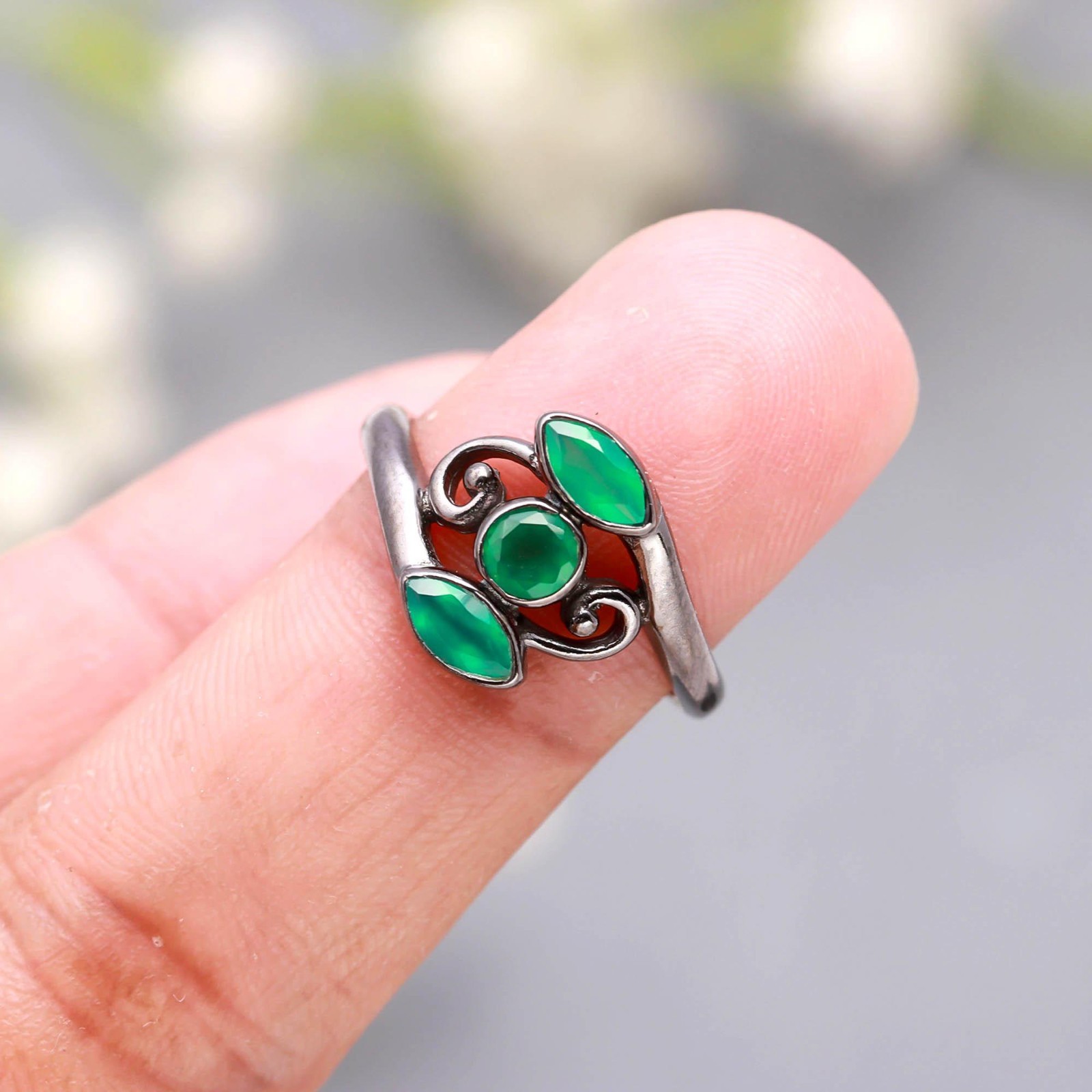 как выглядит Natural Green Onyx Marquise Shape Ring Oxidized Sterling Silver Vintage Jewelry фото
