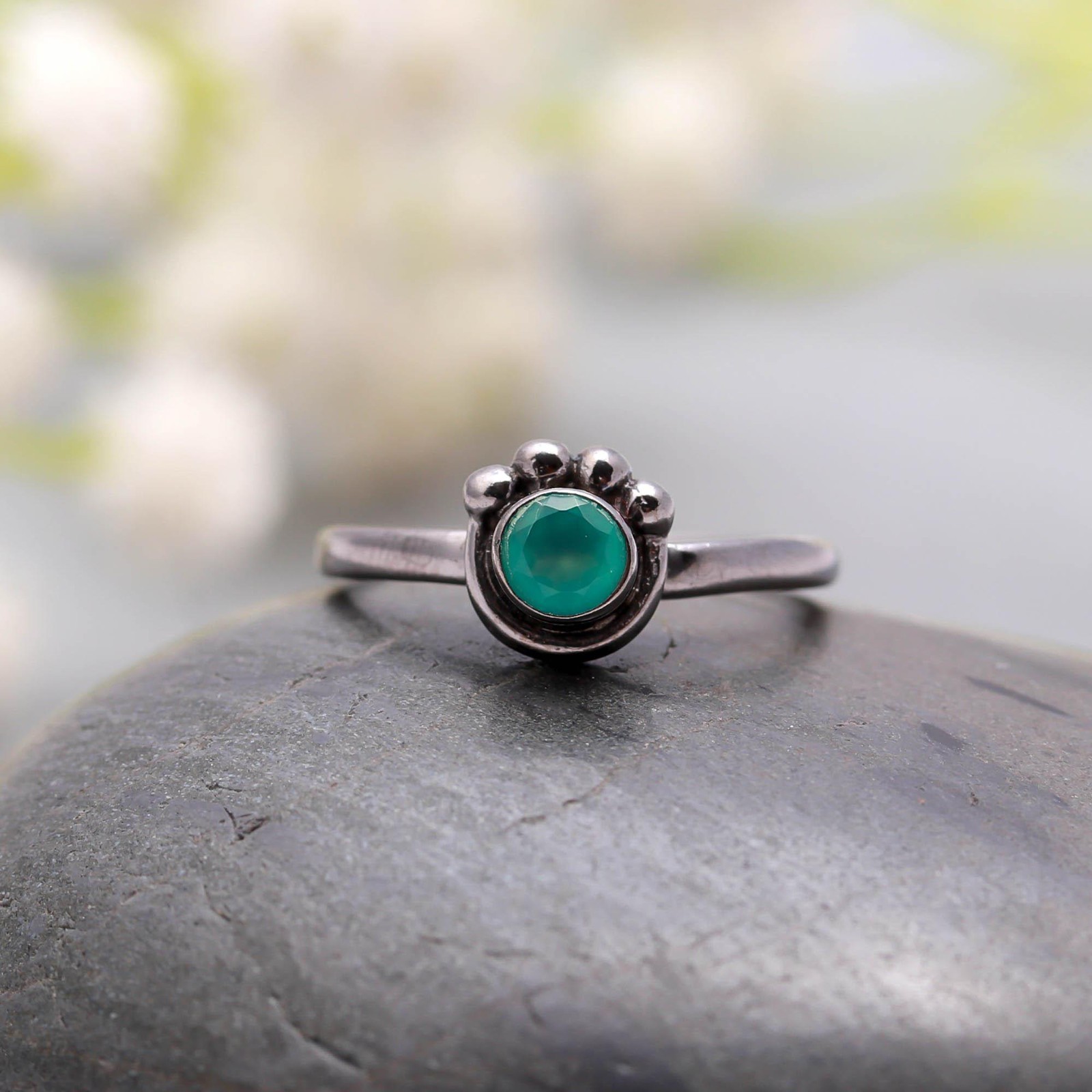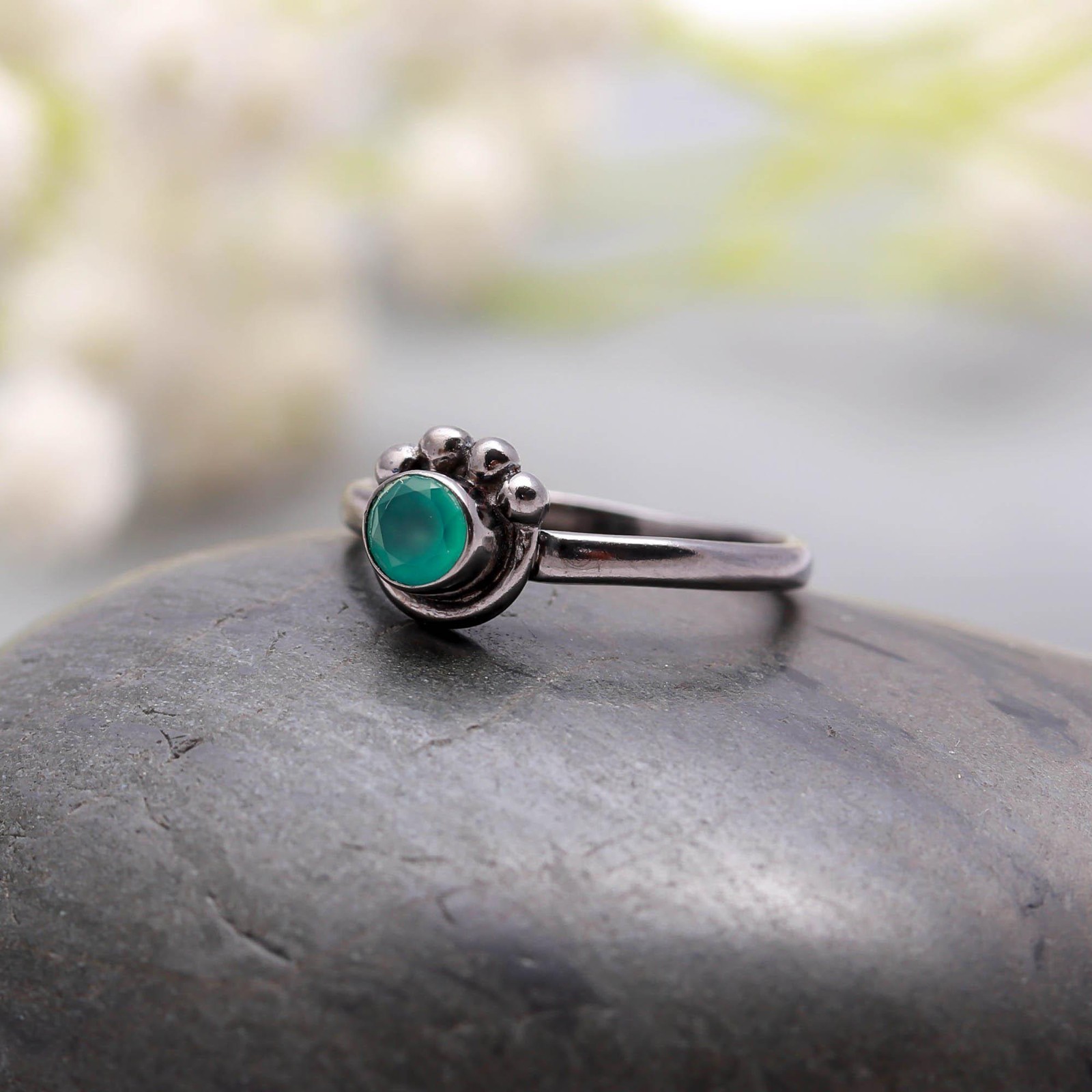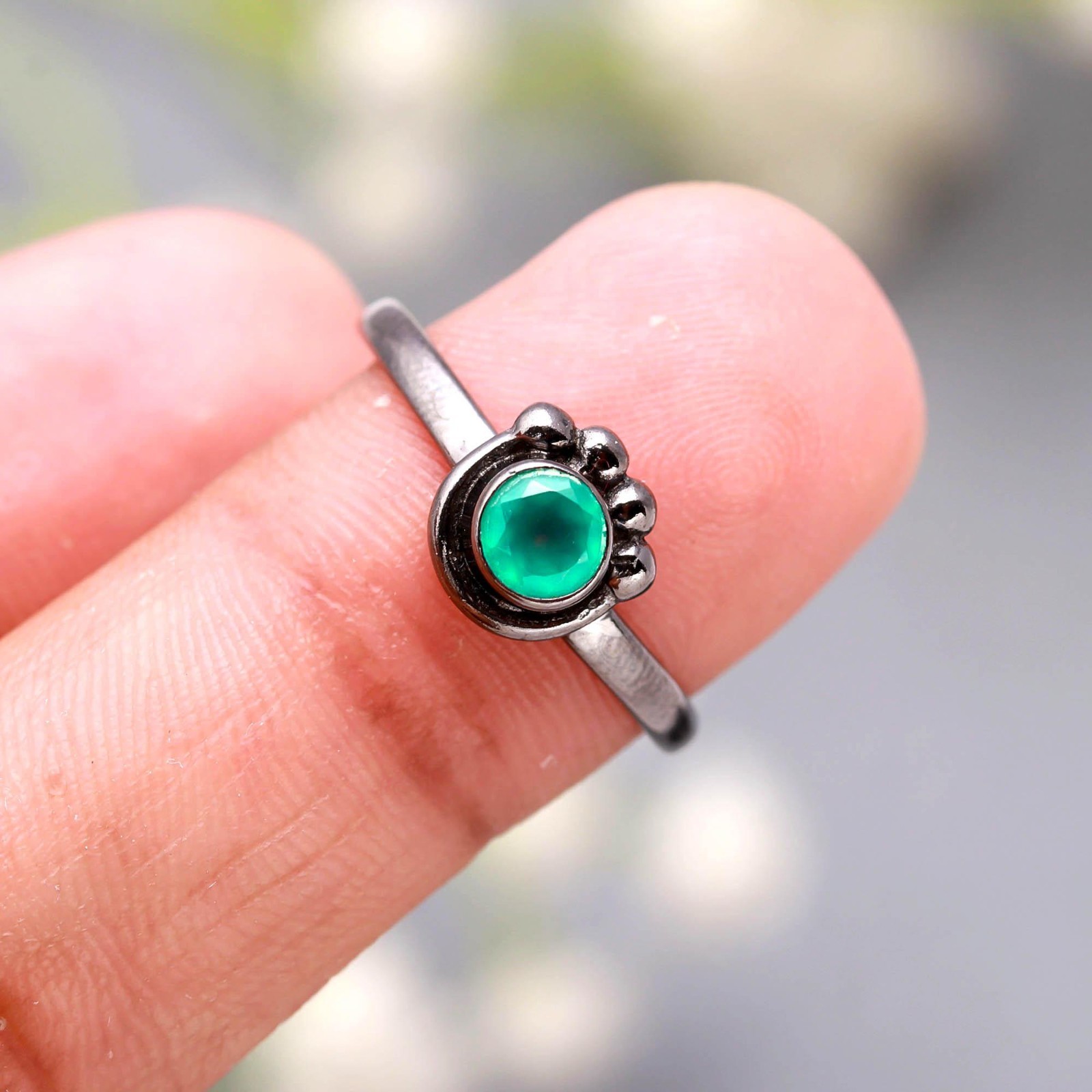 как выглядит Natural Green Onyx Round Shape Ring Oxidized Sterling Silver Minimalist Jewelry фото