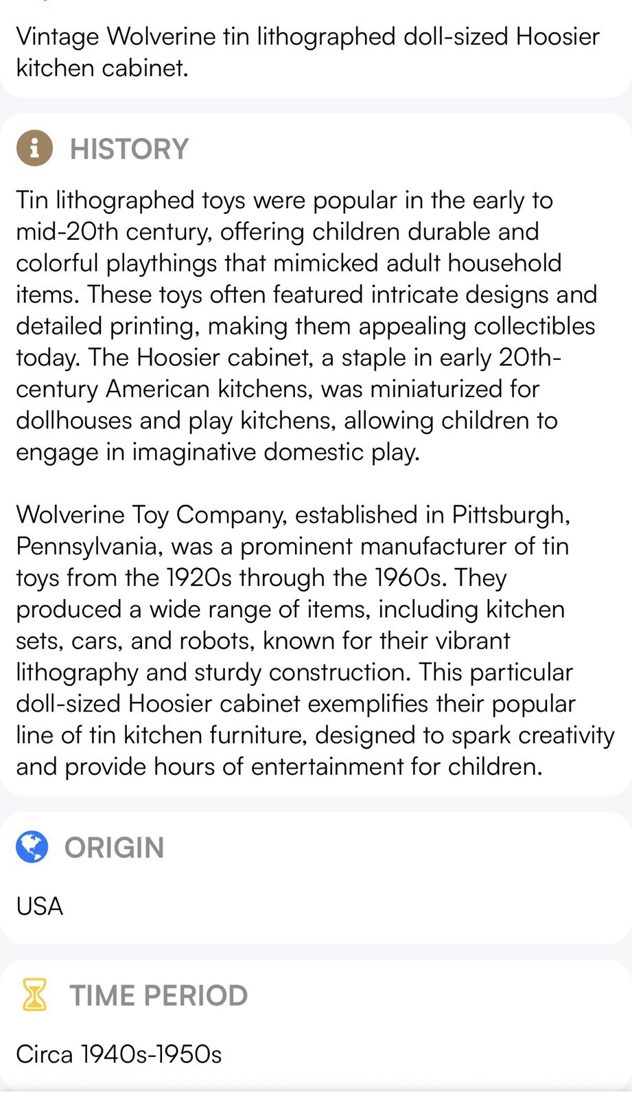 как выглядит Vintage Wolverine Tin Lithographed Doll Sized Hoosier Kitchen Cabinet фото