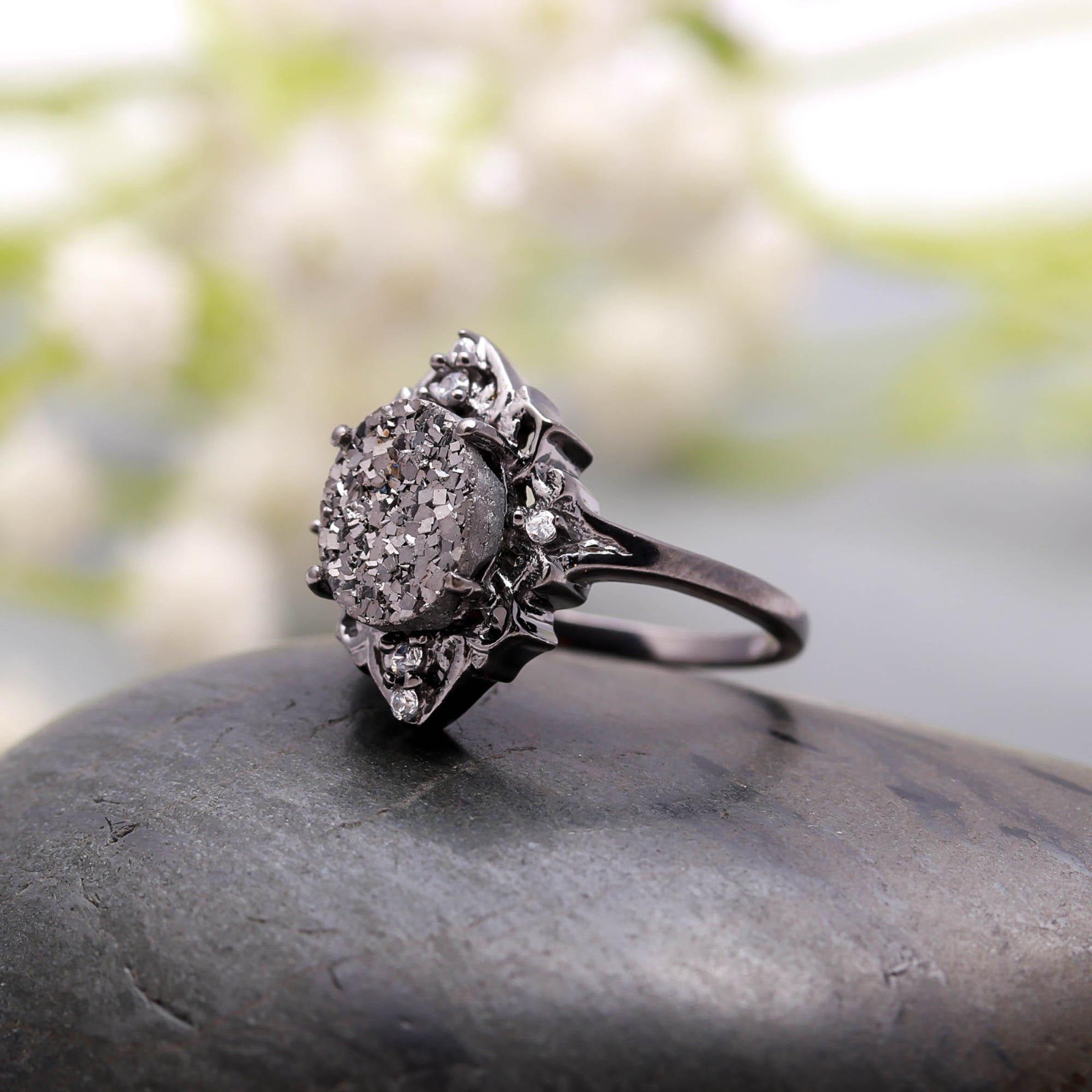Natural Pyrite Oval Shape Ring Black Oxidized 925 Sterling Silver Dainty Jewelry