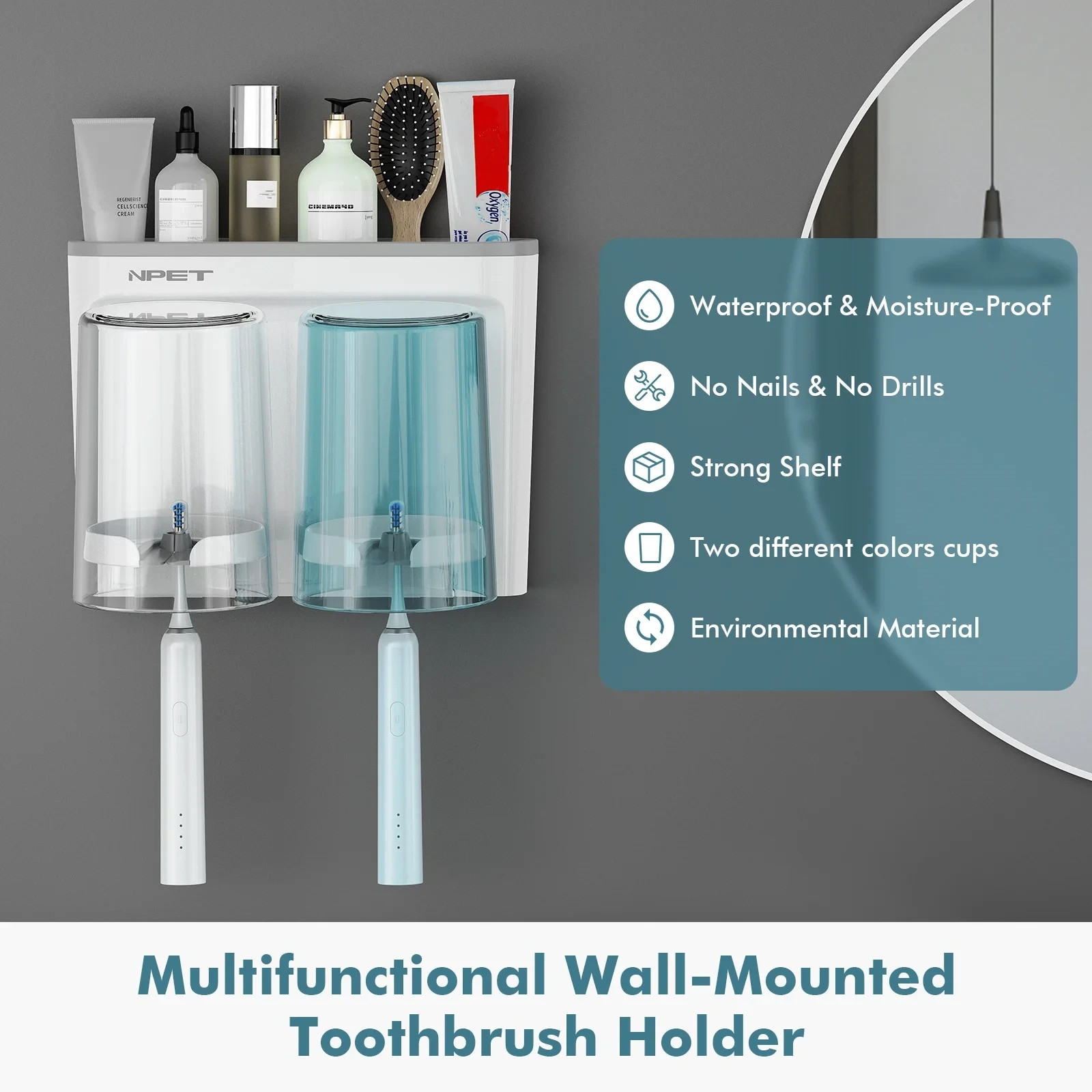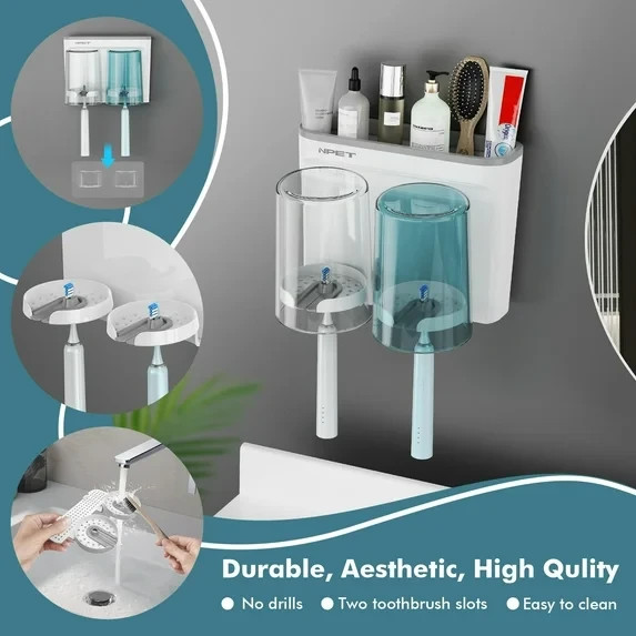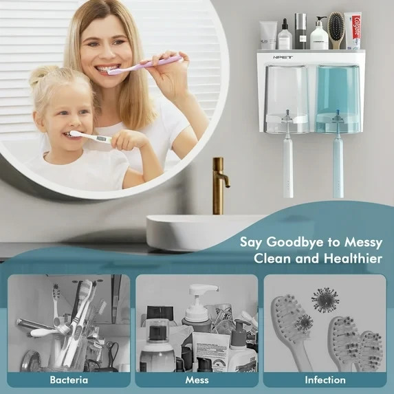 Wall Mounted Toothbrush Holder w Cups 2 Slot Organizer
