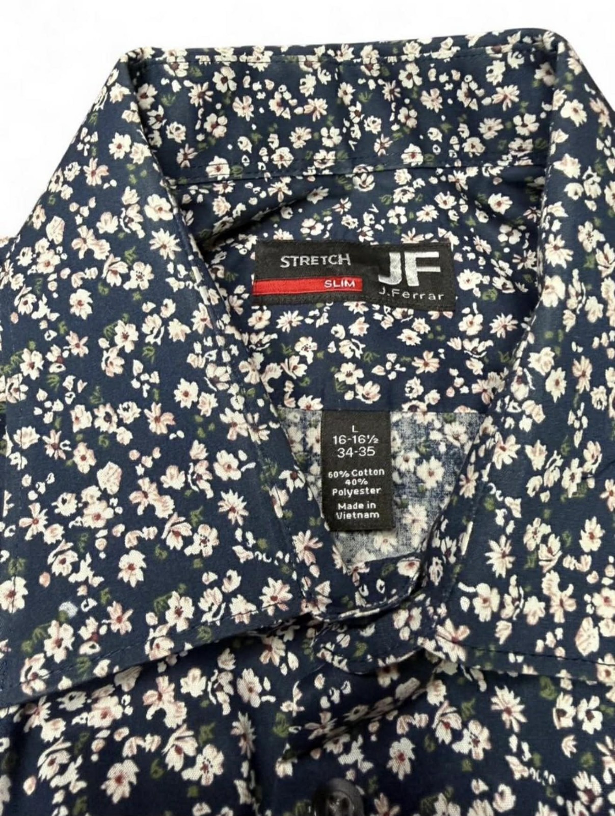 J. Ferrar Navy Blue Floral Button Up Shirt Size L 16-16.5, 34-35
