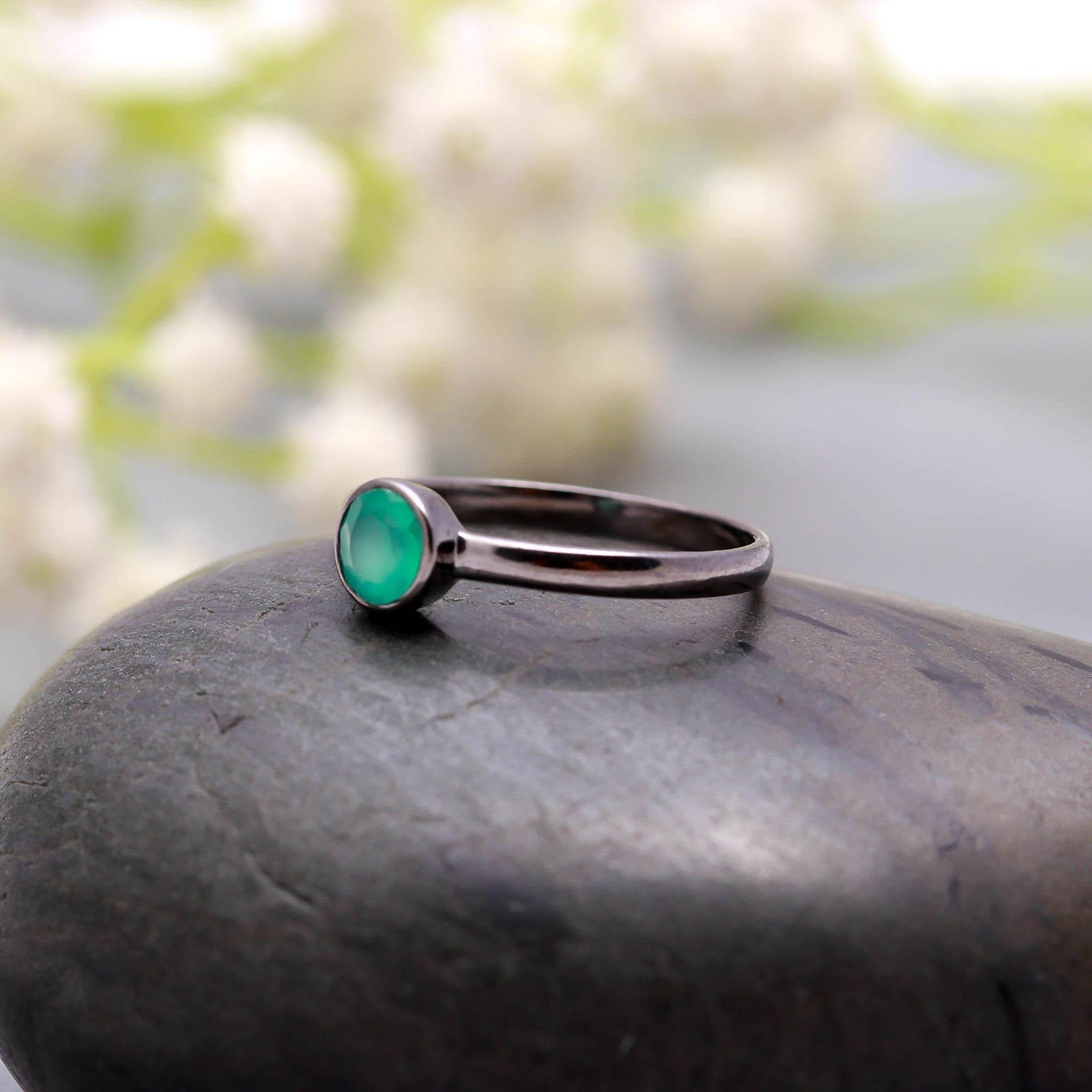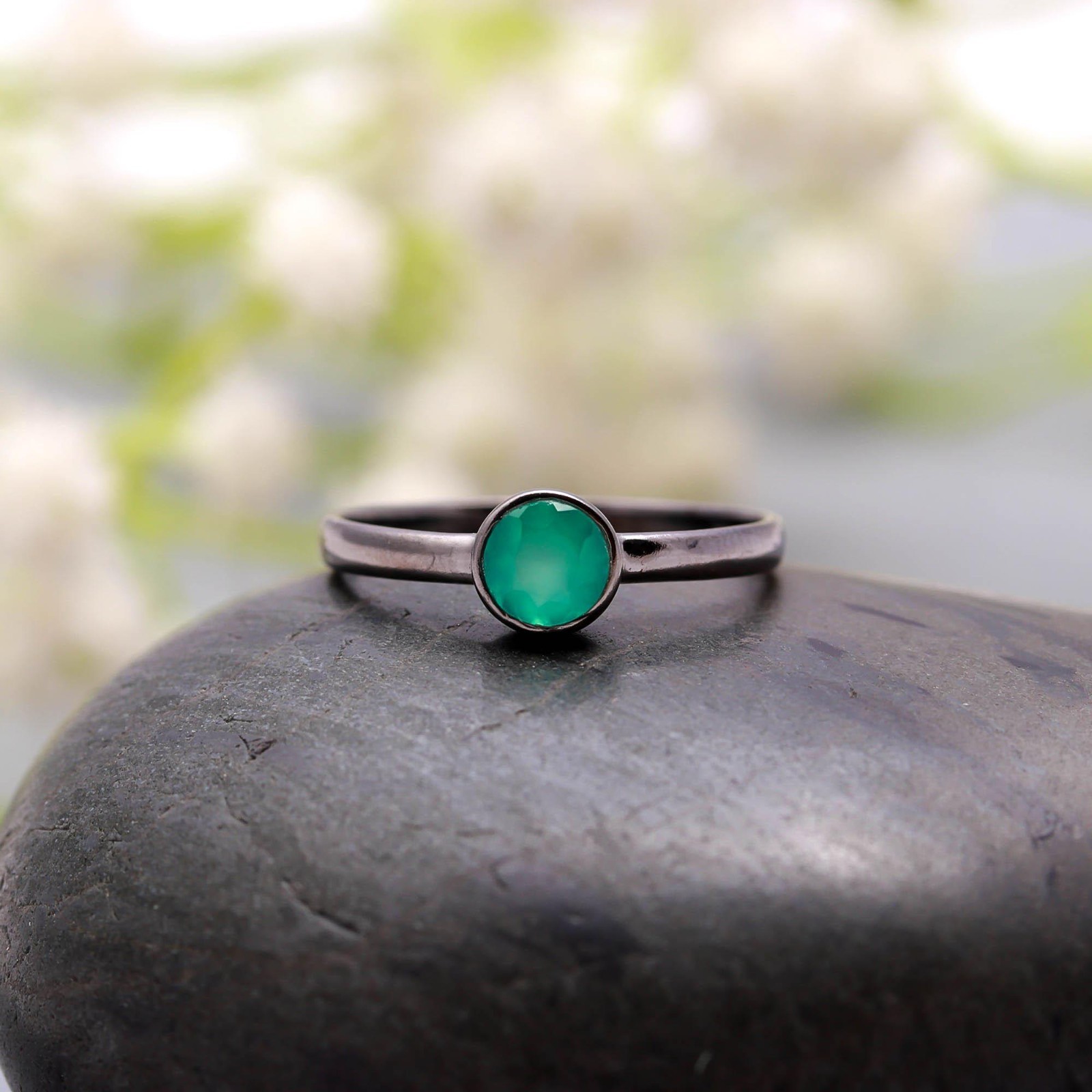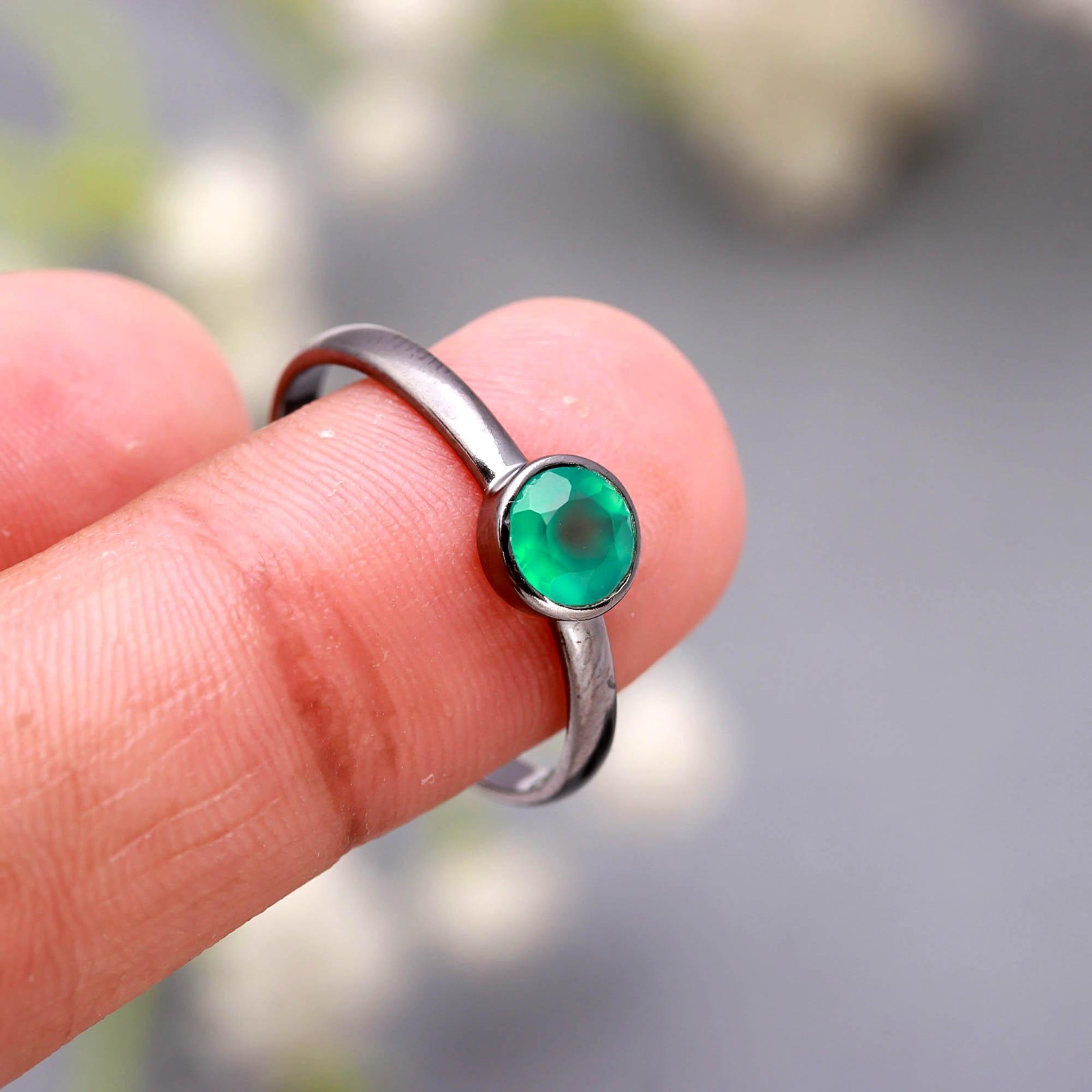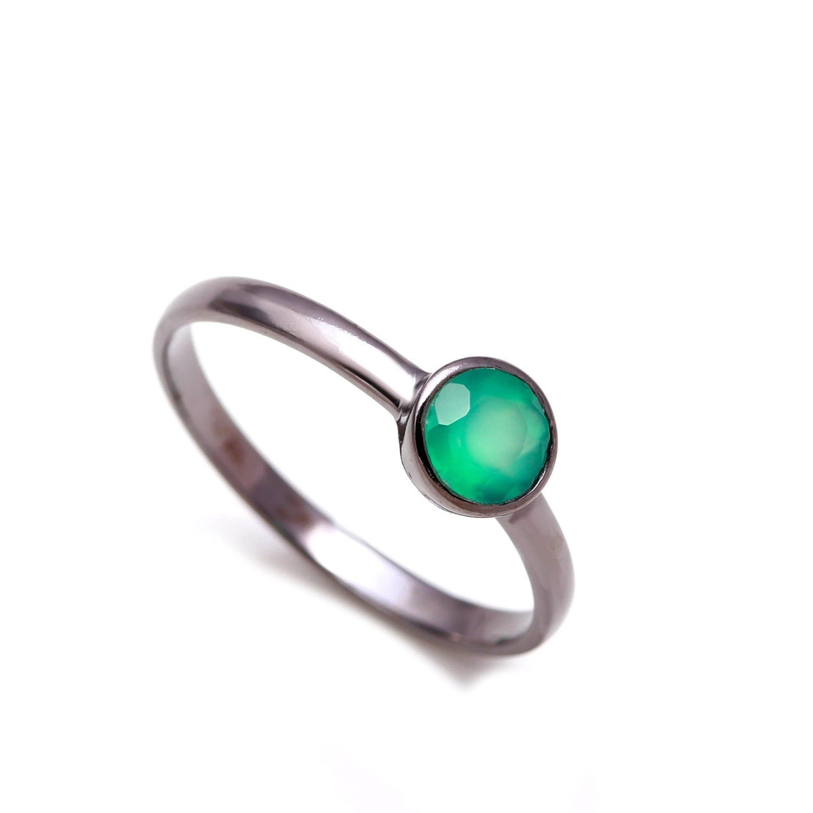 как выглядит Round Shape Green Onyx Ring Black Oxidized 925 Sterling Silver Stackable Jewelry фото