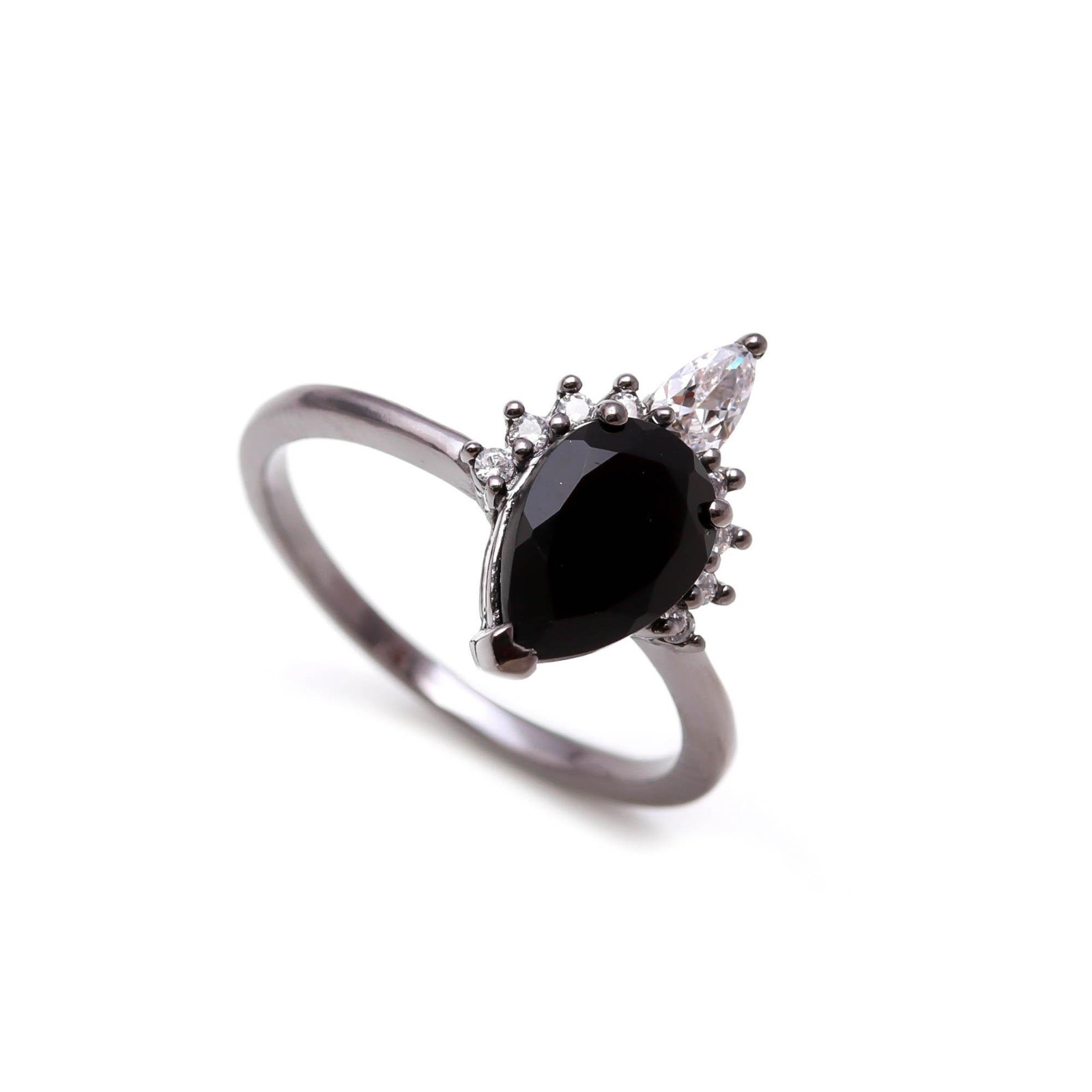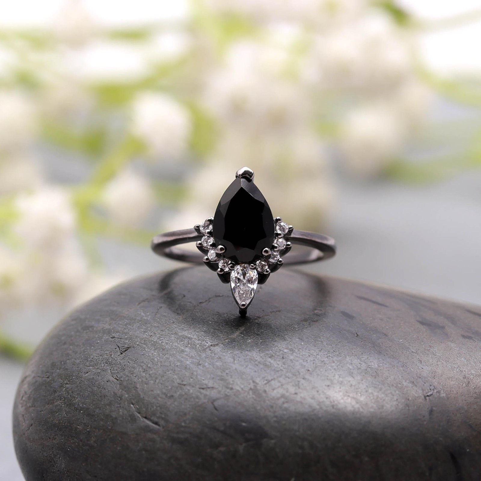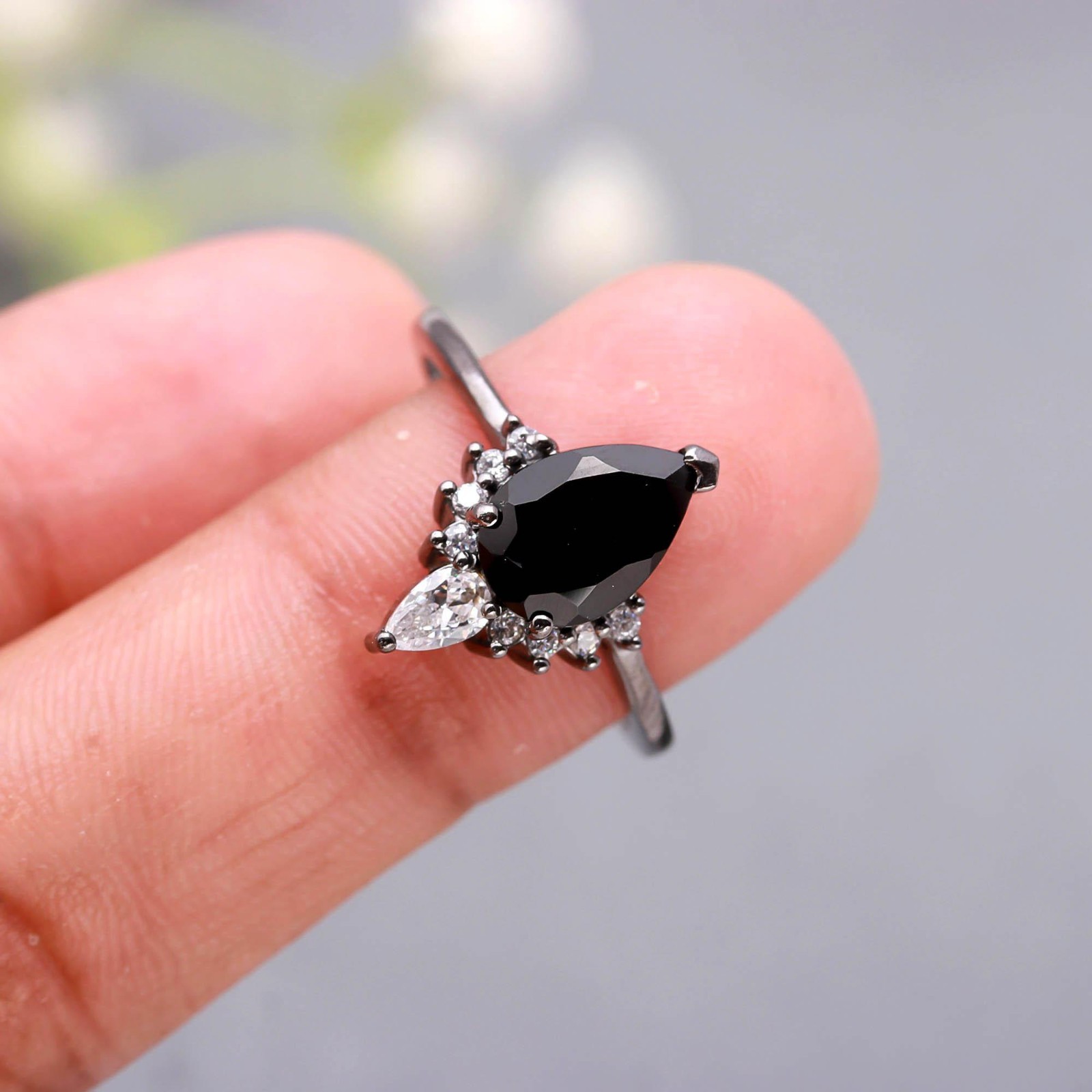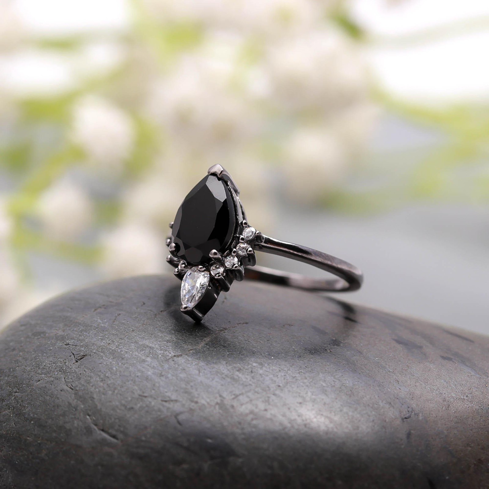 Natural Black Onyx Pear Shape Ring Black Oxidized Solid Silver Elegant Jewelry