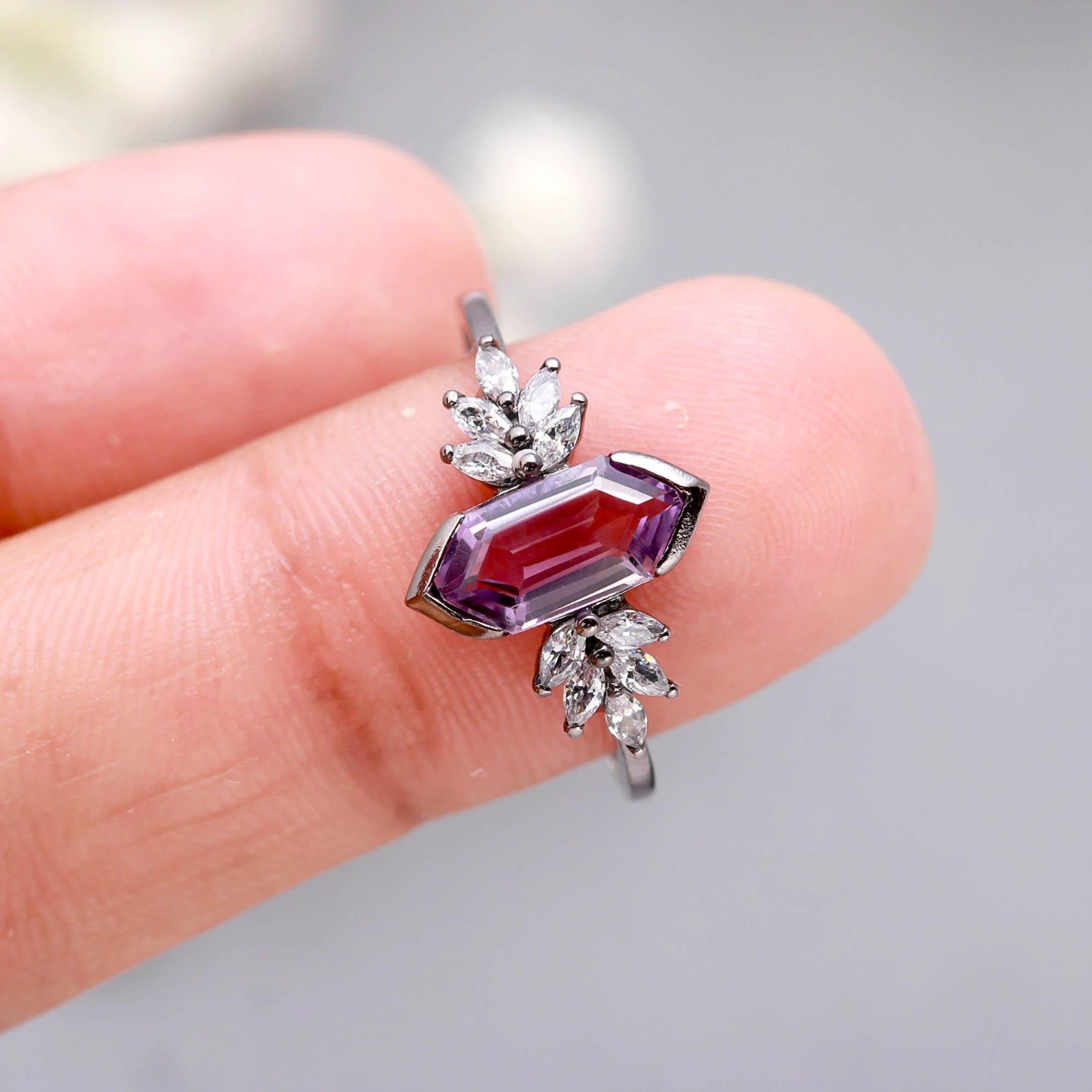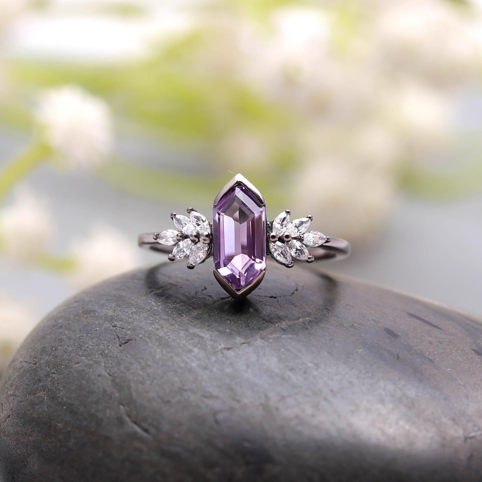 Natural Pink Amethyst Hexagon Ring 925 Sterling Silver Oxidized Jewelry For Her