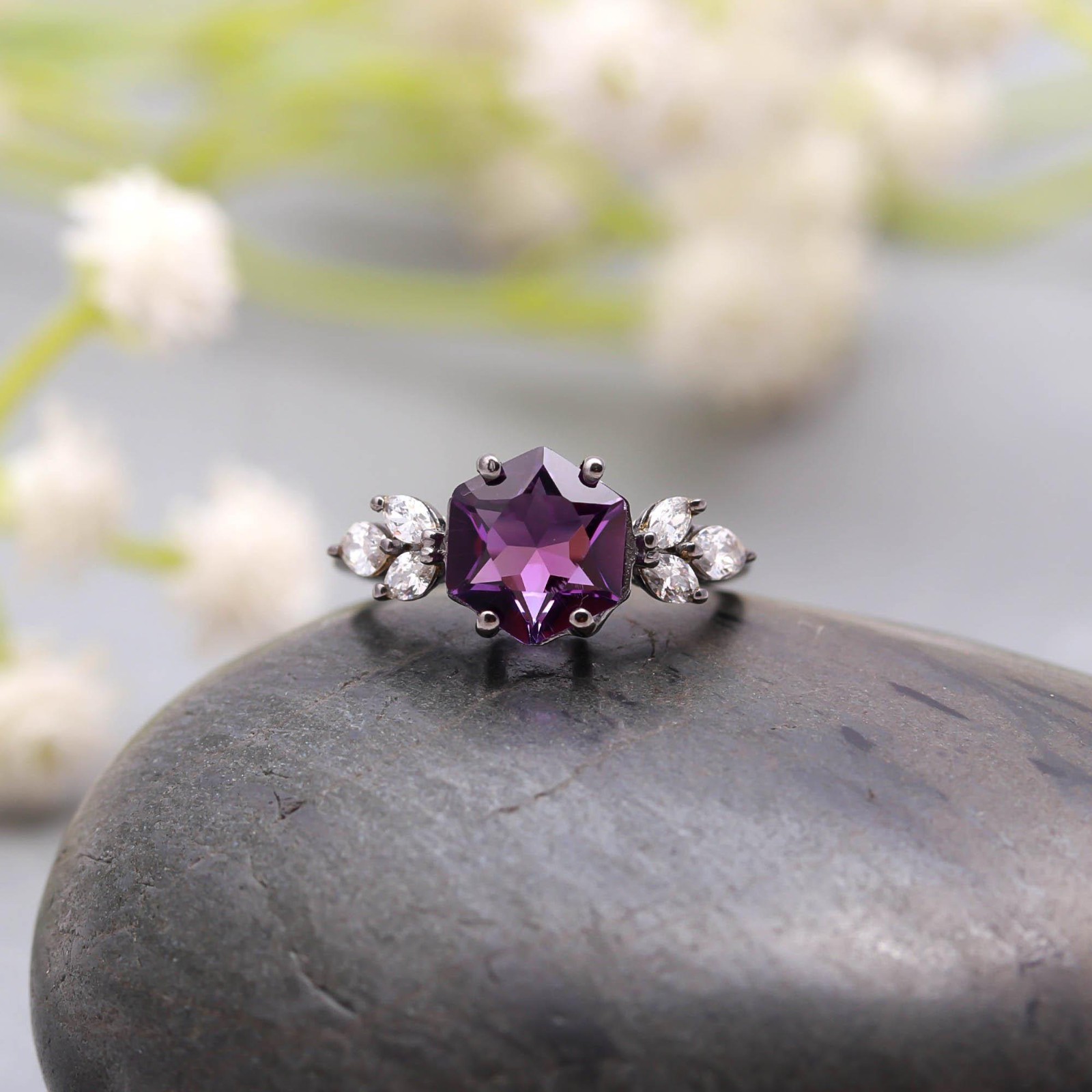 Natural Pink Amethyst Hexagon Ring 925 Sterling Silver Black Oxidized Jewelry