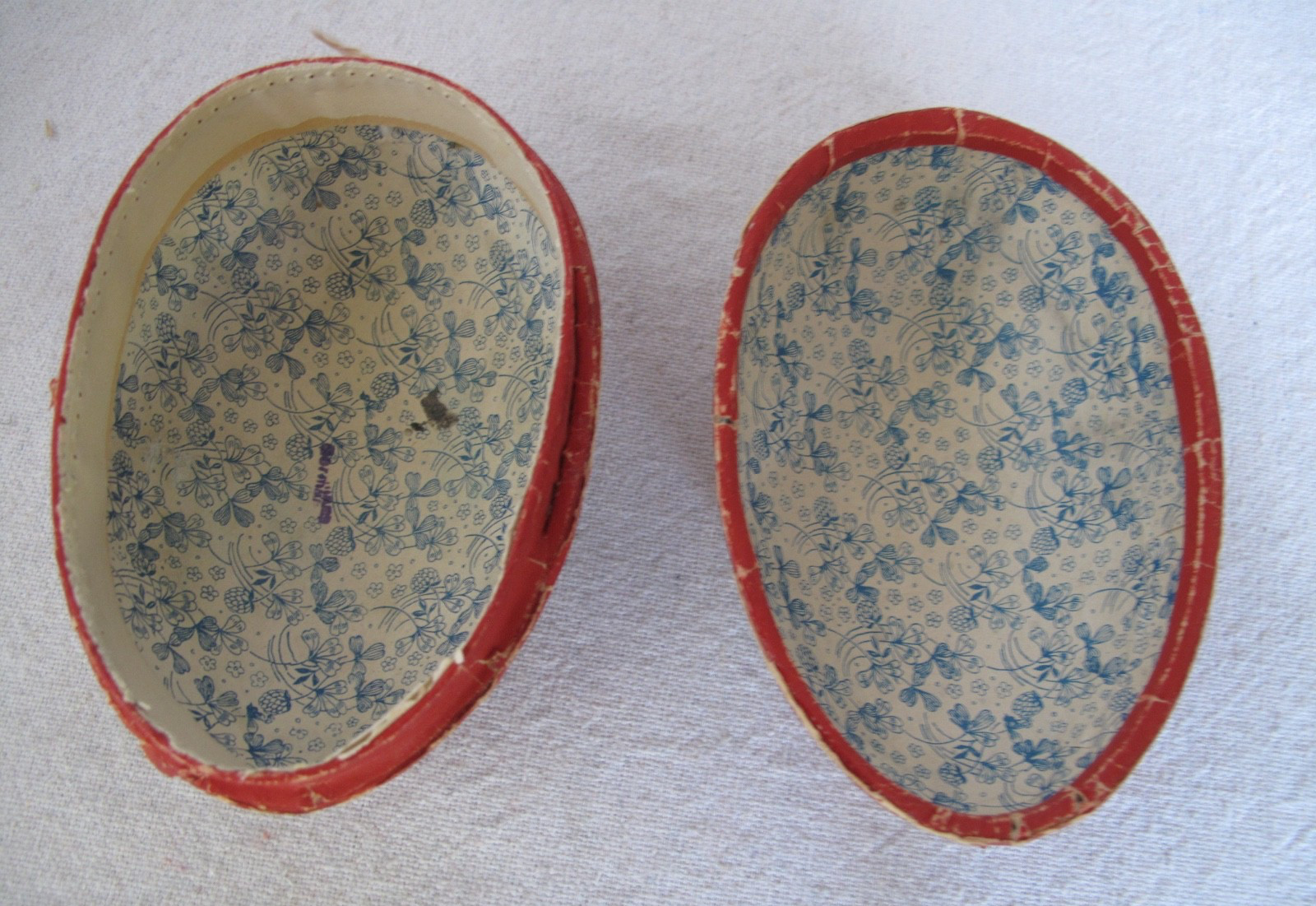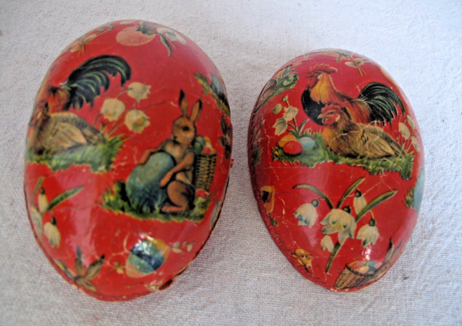 • Antique German Paper Mache 4 long Easter Egg Candy Container Bunny Chickens