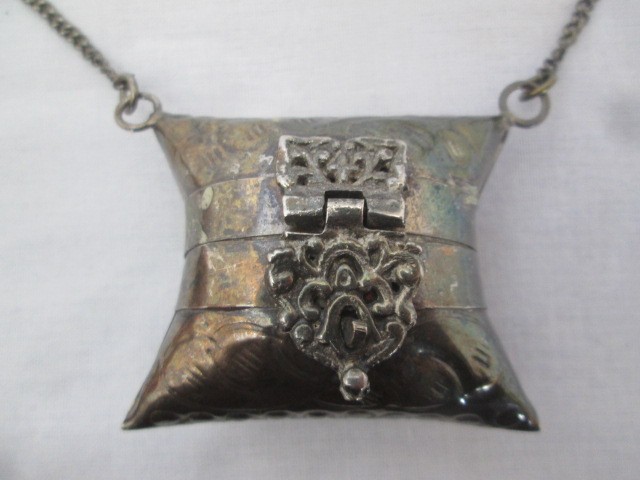 как выглядит Vintage Silver Plated Pillow Purse Necklace Engraved 38" Chain Velvet Lined фото