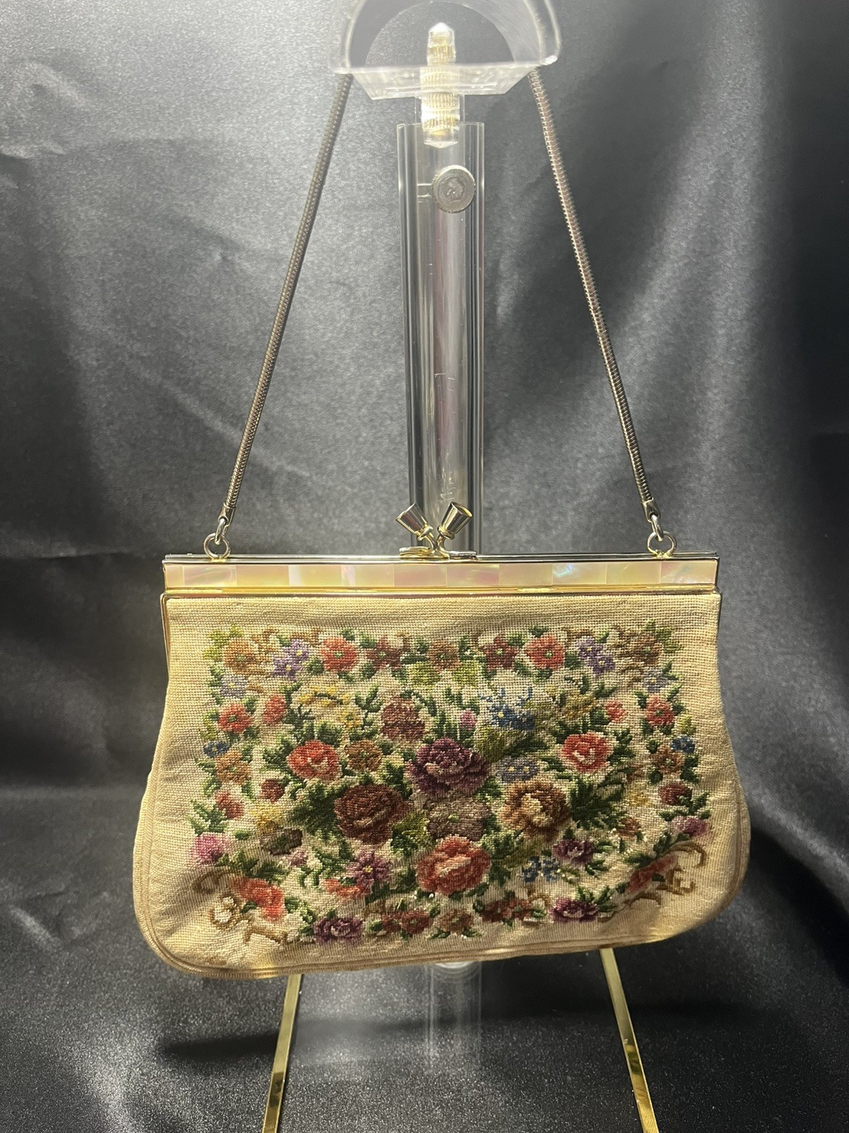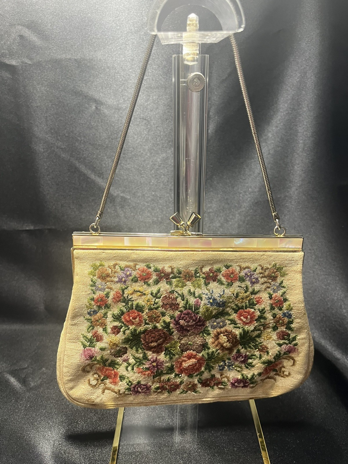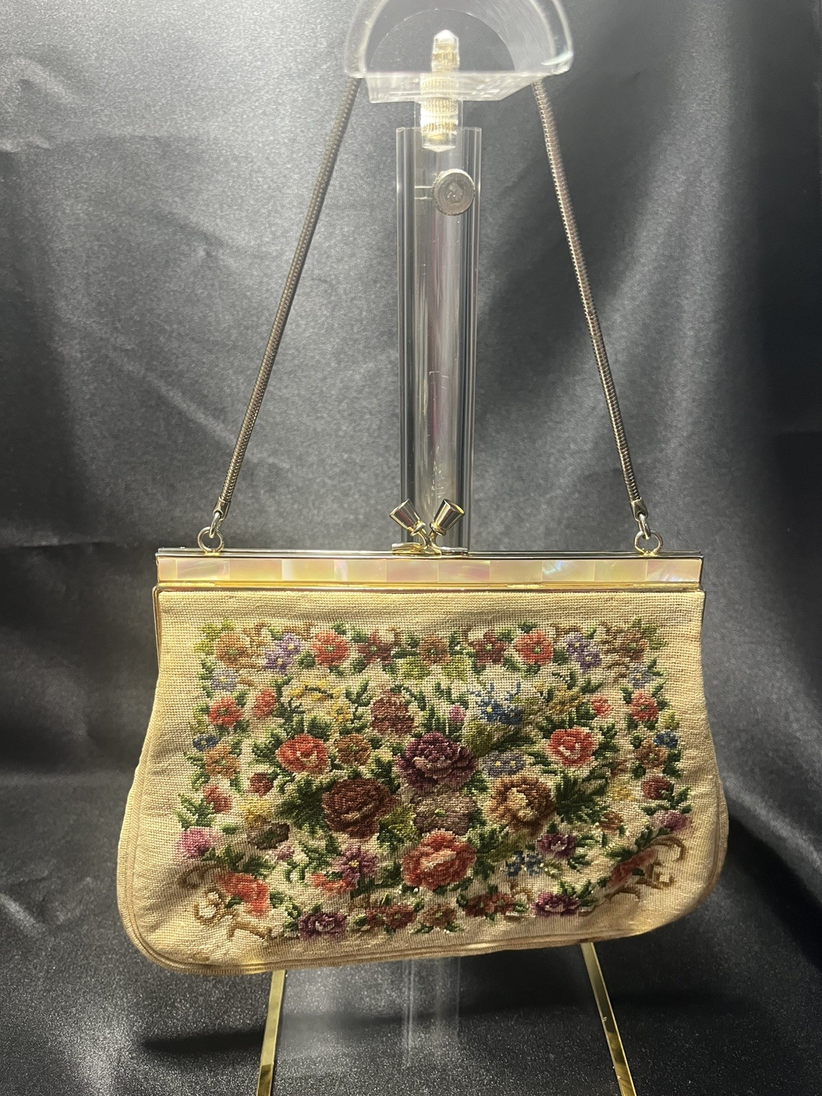 Vintage Floral Tapesty HandBag W Gold Kiss Lock Mother of Pearl Frame