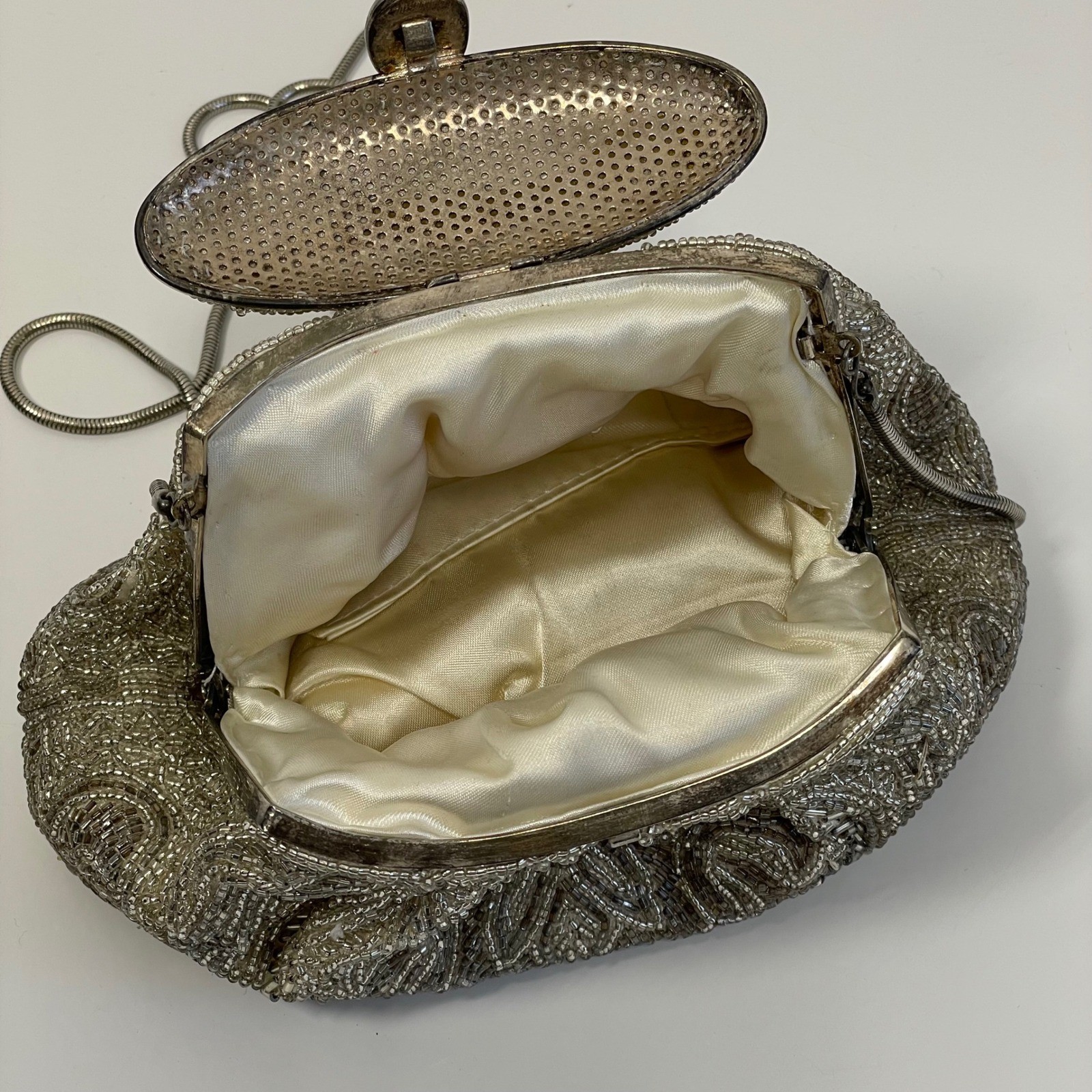 Vintage La Regale Silver Beaded Evening Bag Frame Clutch Snake Chain Crossbody