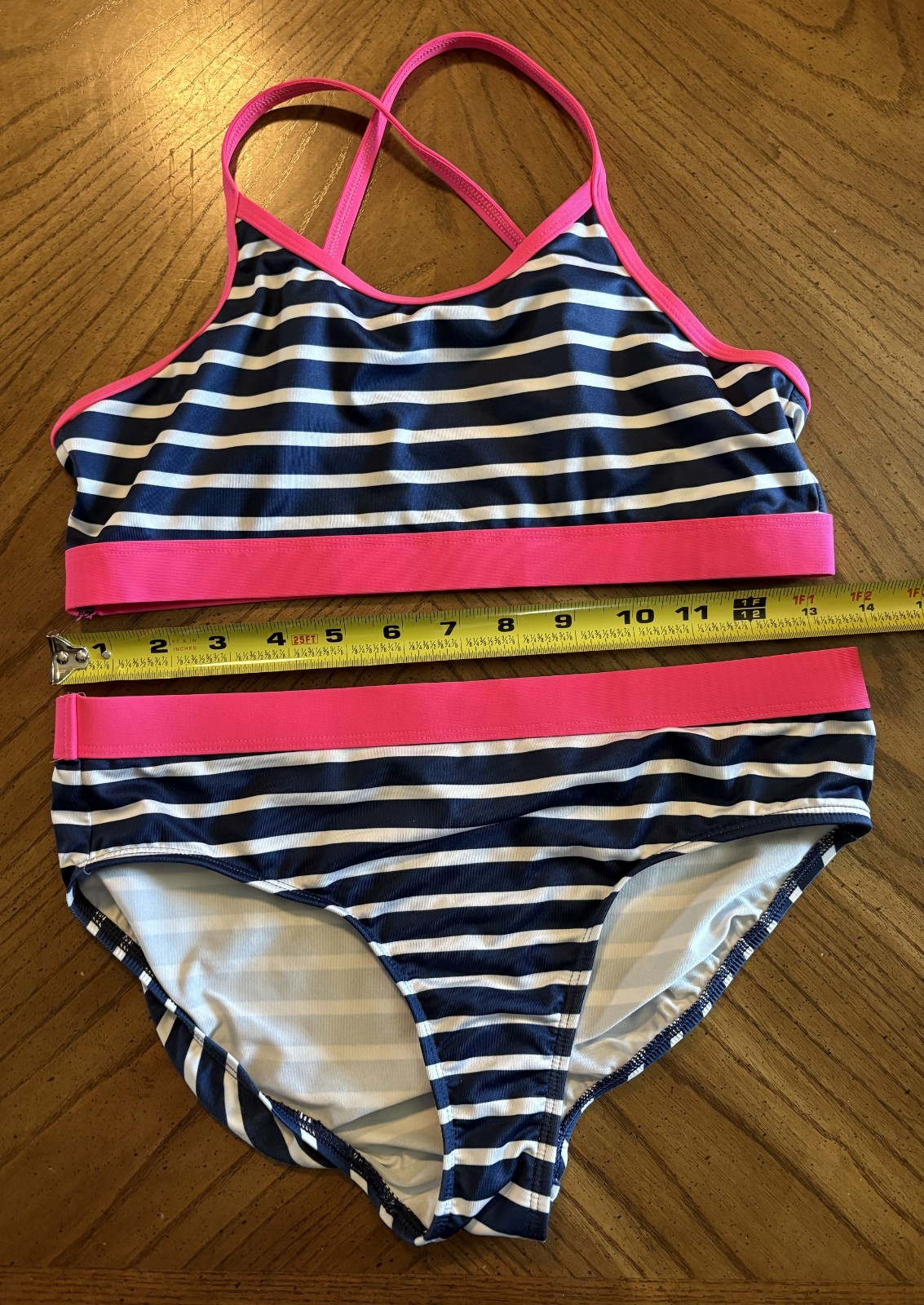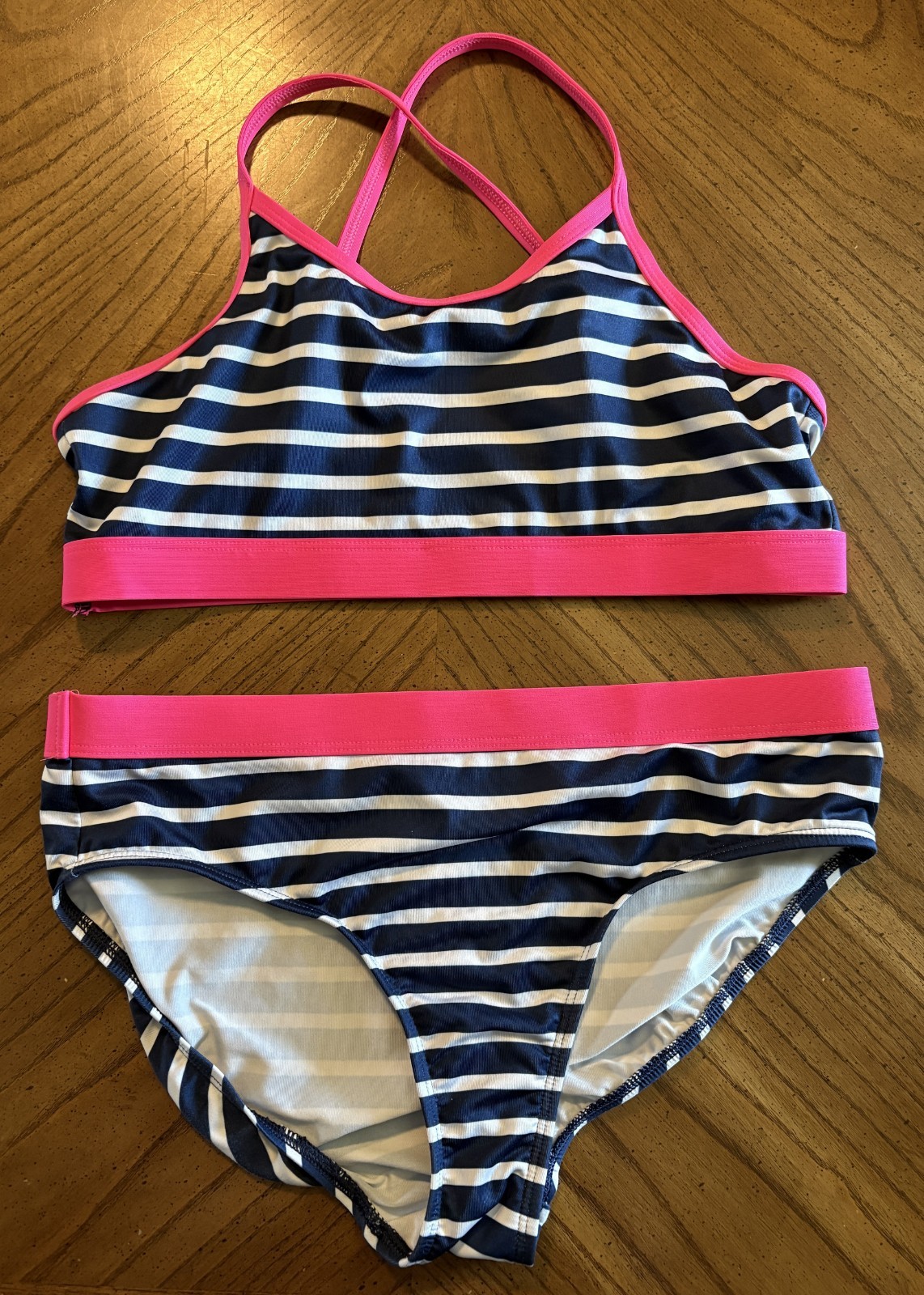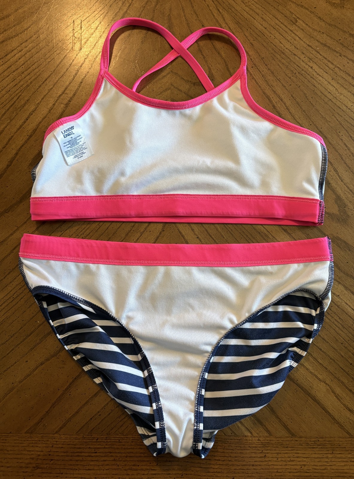 как выглядит Lands End Girls Pink/Navy/White Bikini Top and Bottoms UPF 50 Swimsuit, Size 14 фото