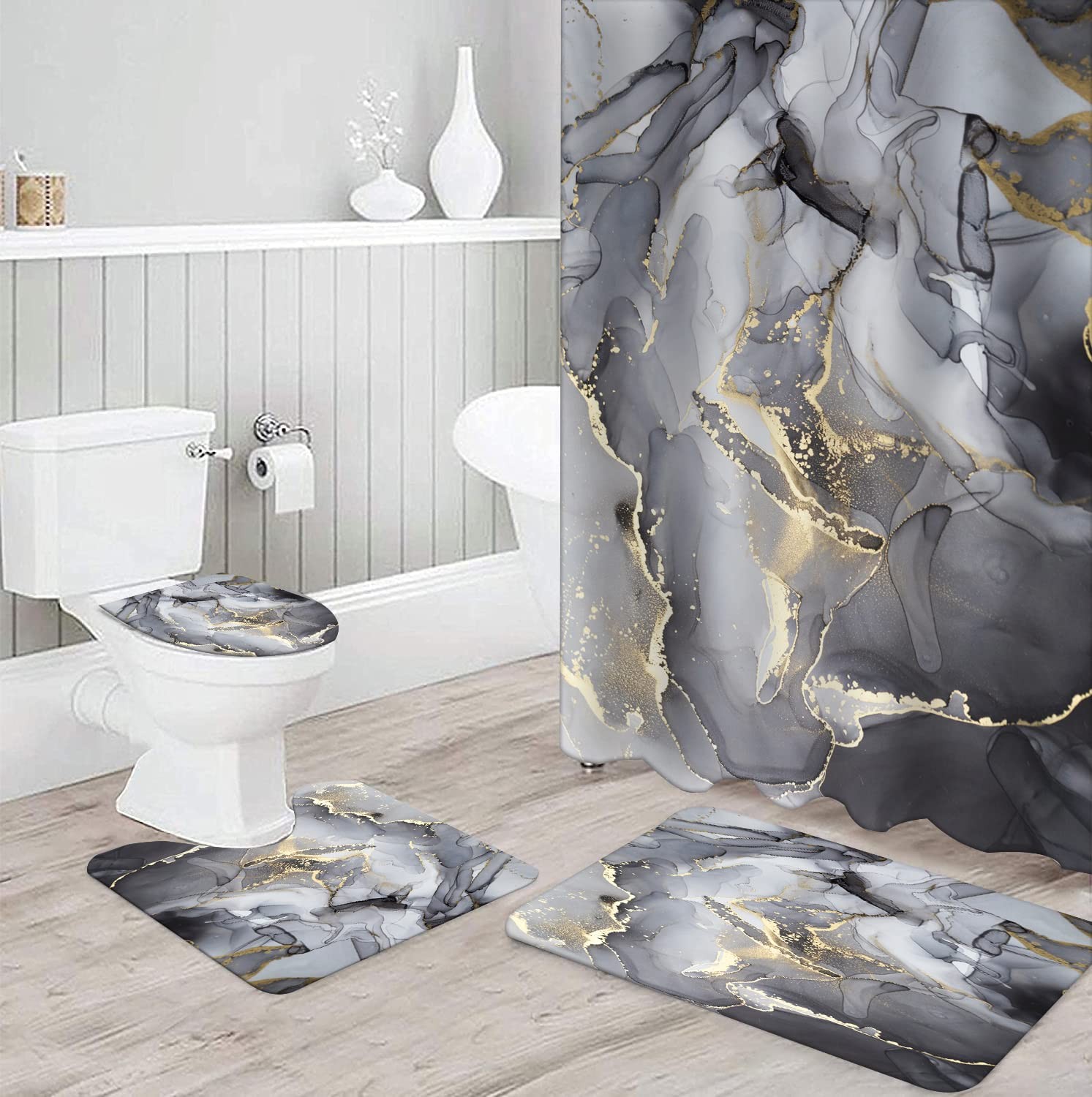 Black Gray Gold Marble Bathroom Sets with Rugs for Bathroom Decor, 72x72 Inch...