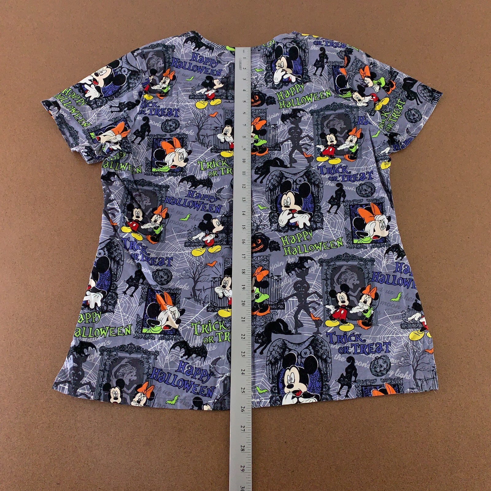 Disney Women's Medium Gray Mickey Minnie Mouse Halloween 3 Pocket Scrub Top